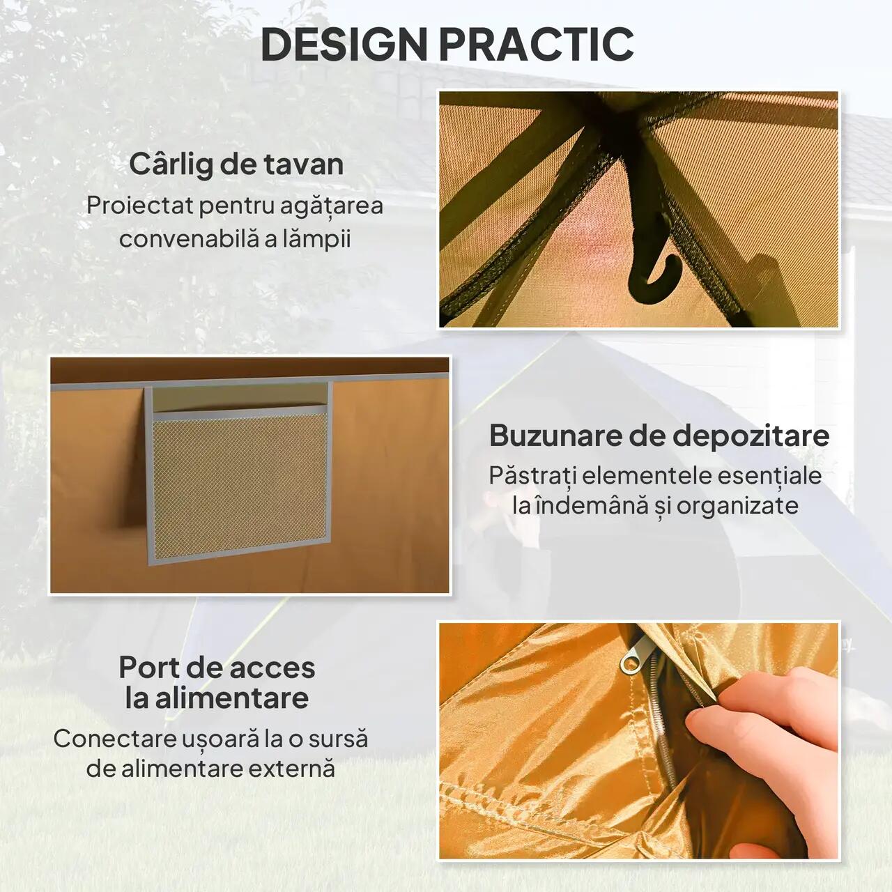 - Cortul beneficiaza inclusiv de un material cu rol de podea, cusut. Acest material pastreaza interiorul uscat in cazul in care ansamblul este instalat pe o suprafata umeda.