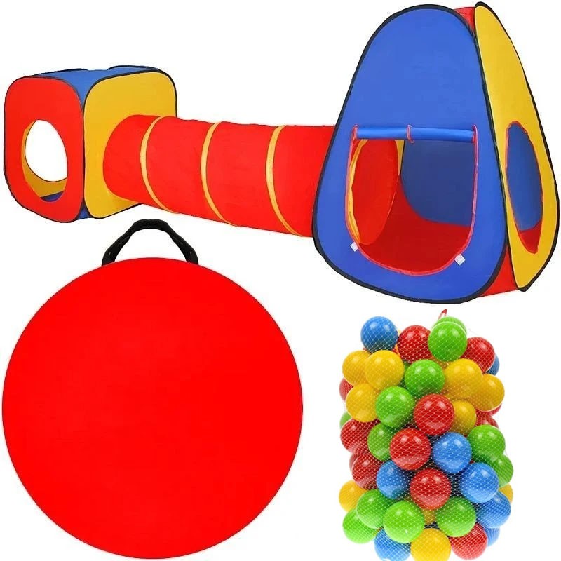 Cort de joaca 3 in 1 pentru copii, set 100 mingi multicolore, tunel, cort iglu, cub, poliester, 300x80x86 cm