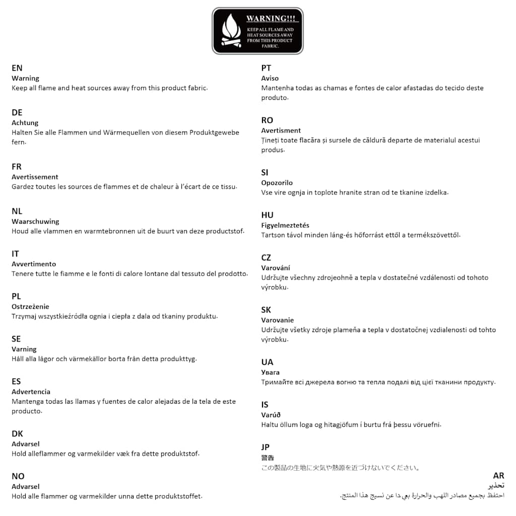 - Țineți orice flăcări și surse de căldură departe de acest material textil.