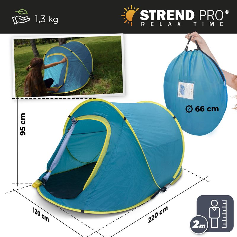 Bucură-te de zilele însorite la mare sau la picnic cu acest cort de plajă pop-up Strend Pro, potrivit atât pentru adulți, cât și pentru copii. Designul albastru-galben oferă umbră rapidă, iar materialul din poliester rezistent la UV și la apă ajută la protecție și confort în timpul relaxării.