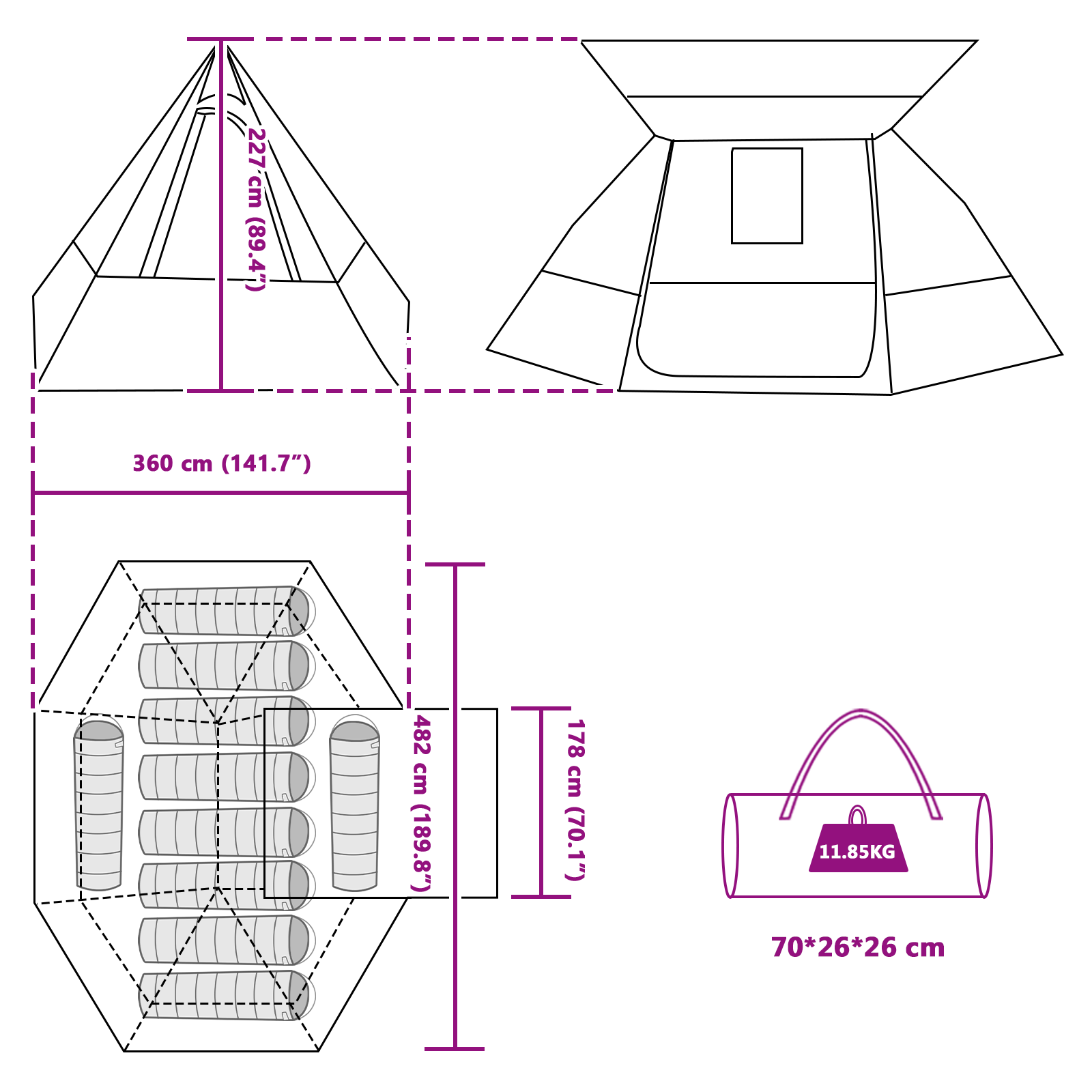 - Conținutul livrării: 1 x Cort, 4 x Stâlp (173 cm), 2 x Stâlp (204 cm), 4 x Șnur (300 cm), 2 x Șnur (350 cm), 14 x Cuie, 1 x Geantă de transport<\li><\ul> Avertisment Țineți toate flacăra și sursele de căldură departe de materialul acestui produs.