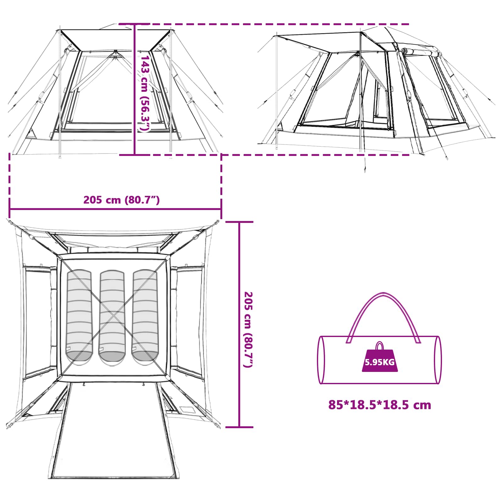 - Dimensiuni generale: 205 x 205 x 143 cm (L x l x î)