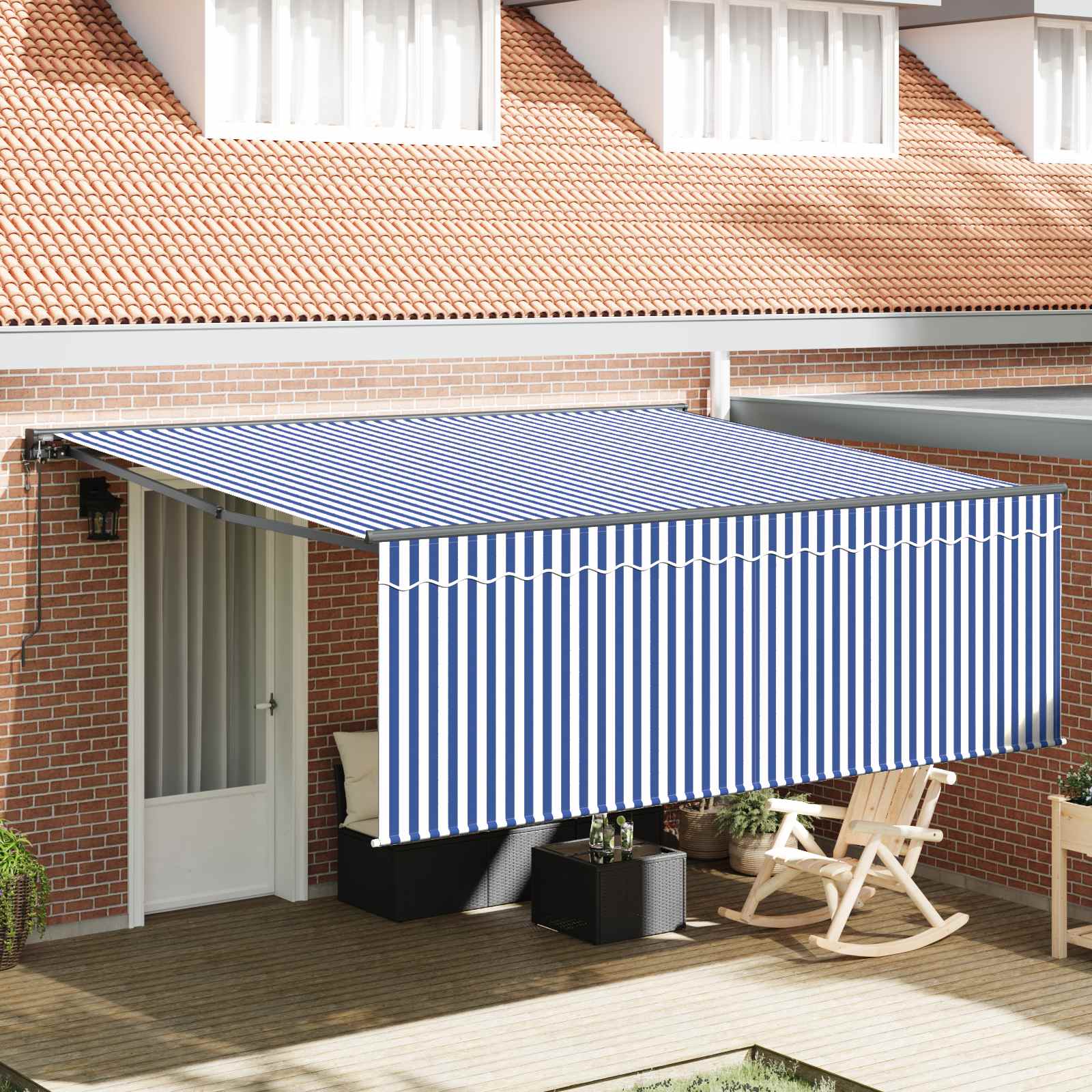 Marchiza retractabilă se desfășoară pe o dimensiune generoasă de 400 x 300 cm, oferind umbră mare pentru spațiile tale exterioare. Designul său elegant este perfect pentru a îmbunătăți grădina sau terasa ta, oferind adăpost practic împotriva soarelui și a ploii. E simplu de folosit și se potrivește frumos în orice decor modern.