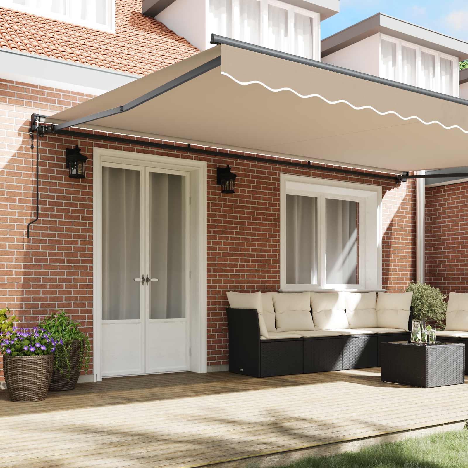 Această marchiză retractabilă îți oferă o umbră practică pentru spațiile exterioare, cum ar fi grădinile și terasele. O poți extinde sau retracta ușor ca să ajustezi câtă lumină și protecție ai nevoie. E perfectă pentru activități ca servirea mesei afară, relaxarea sau primirea musafirilor, ajutând la crearea unui mediu mai confortabil, protejând de soare și de ploaia ușoară. Această marchiză e o adăugare faină pentru a profita la maximum de spațiile exterioare pe tot parcursul anului.