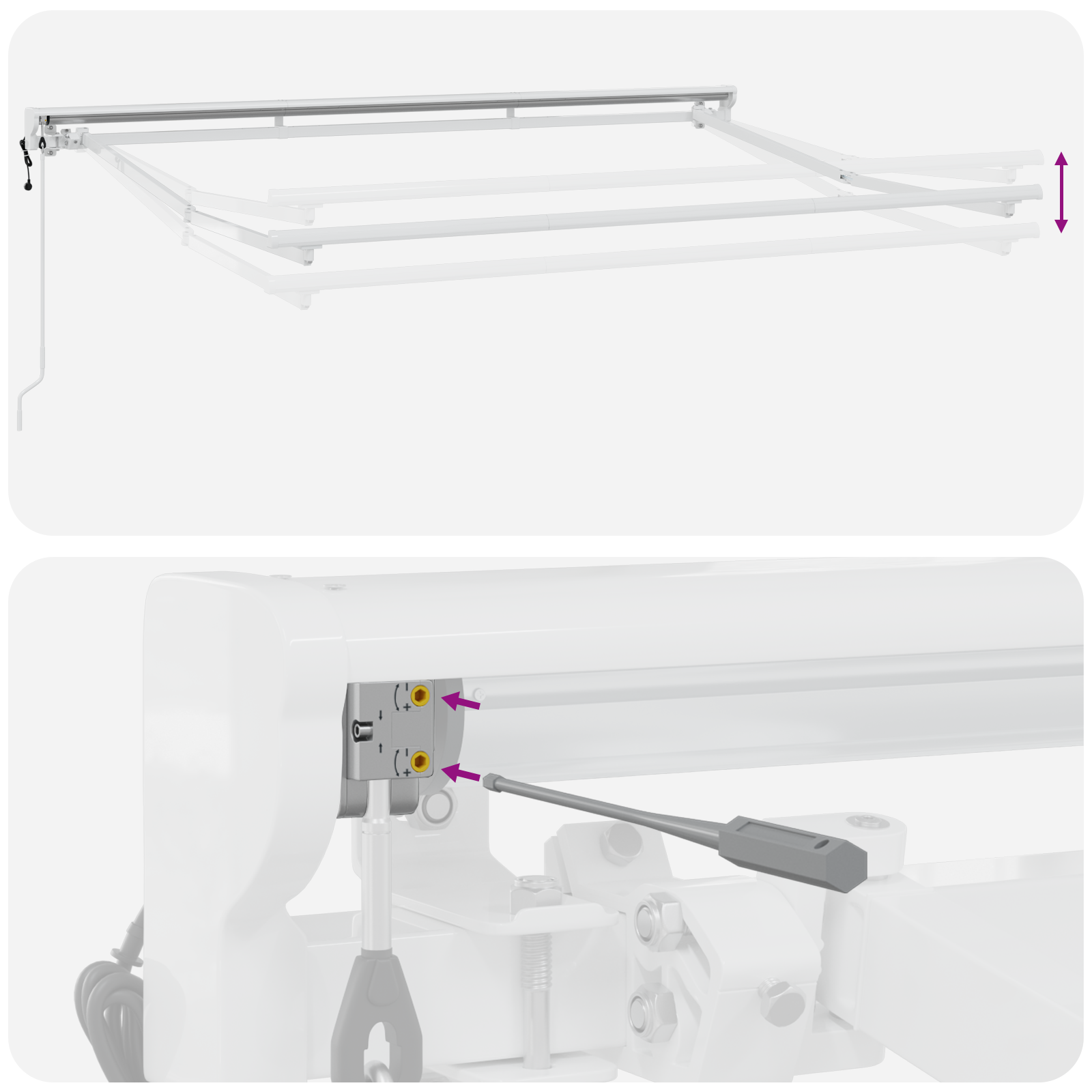 - Necesită asamblare: Yes<\li><\ul> Pericol! Arc puternic la deschidere. NU îndepărtați această funie dacă nu ați finalizat toate etapele de asamblare cu toate șuruburile fixate și articolul montat pe perete! Avertisment! Aveți grijă când slăbiți brațele, deoarece acestea sunt sub tensiune! O eliberare bruscă a brațului unei copertine cu braț pliabil poate provoca vătămări. Avertisment : Instrucţiunile operatorului trebuie citite înainte de utilizarea acestui produs. Avertisment: Acționarea în condiții de îngheț poate deteriora produsul. Utilizare externă la clădiri și alte lucrări de construcție. Nu permiteți copiilor să se joace cu dispozitivul de control al jaluzelei. Țineți telecomanda departe de copii.