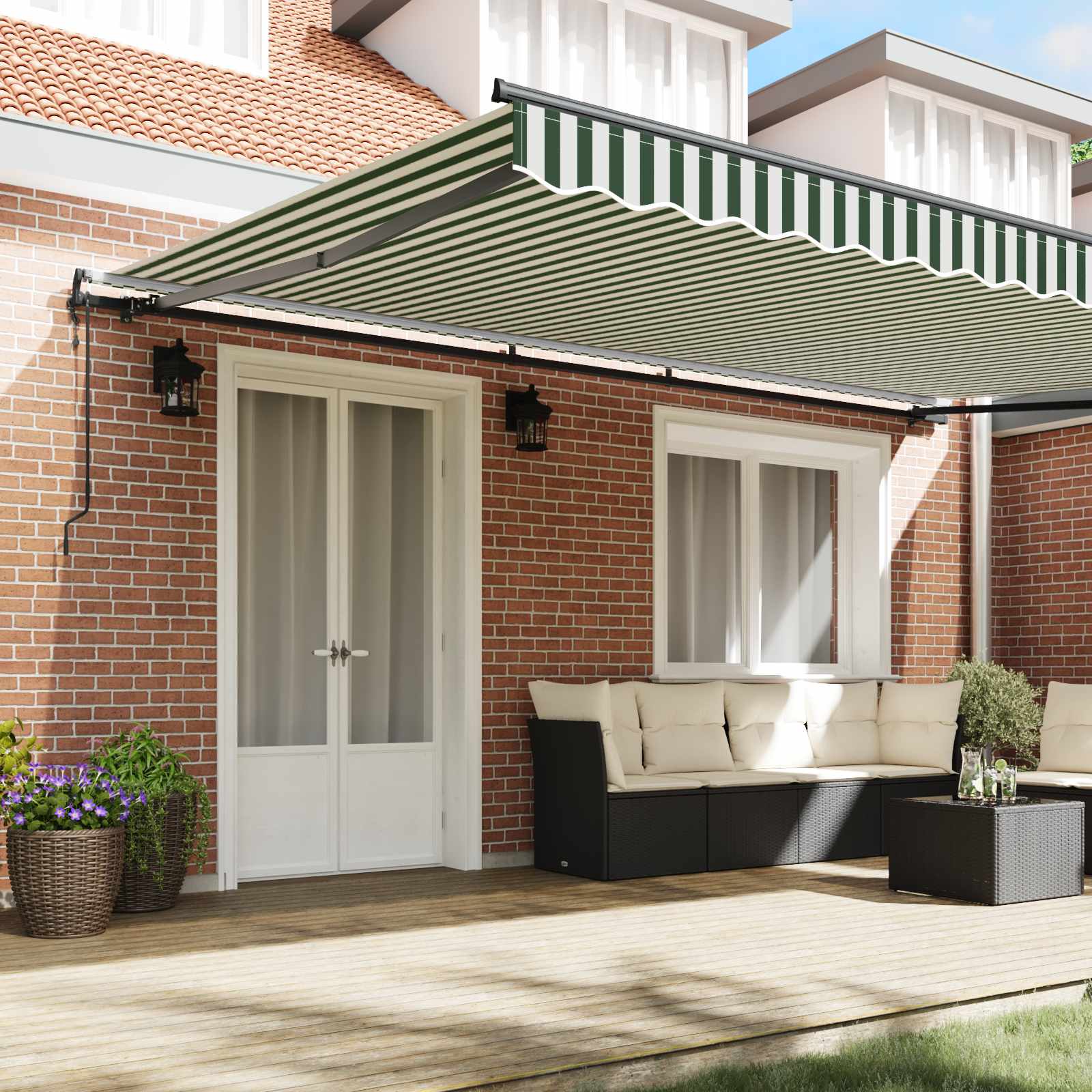 Această marchiză elegantă și modernă, retractabilă, e soluția super pentru umbră exterioară, combinând practicul cu un design stylish perfect pentru grădini și terase. Având un aspect modern cu linii curate și detalii minimale, se potrivește de minune unui exterior contemporan. E adăpostul ideal pentru a te bucura de spațiile tale exterioare pe timpul verii, protejând de soarele puternic și de ploaia ocazională, creând un mediu plăcut pentru relaxare sau întâlniri.