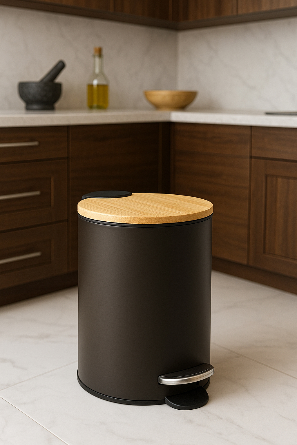 Fabricat din oțel, polipropilenă și bambus, acest coș de gunoi cu pedală este rezistent, ușor de întreținut și potrivit pentru încăperi unde fiecare centimetru contează. Capacitatea de 3 litri îl face ideal pentru resturi mici, produse cosmetice sau deșeuri de birou.