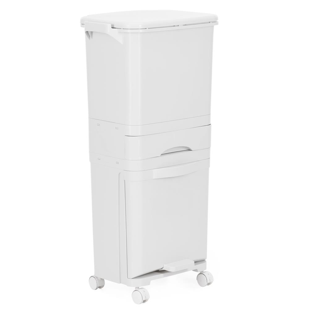 Compartimentul superior este prevăzut cu clapetă, sertarul din mijloc este culisant, iar compartimentul inferior se deschide cu pedală, pentru un plus de confort și igienă. Datorită roților cu sistem de blocare, acest coș reciclare poate fi mutat simplu acolo unde ai nevoie, rămânând stabil în timpul utilizării.