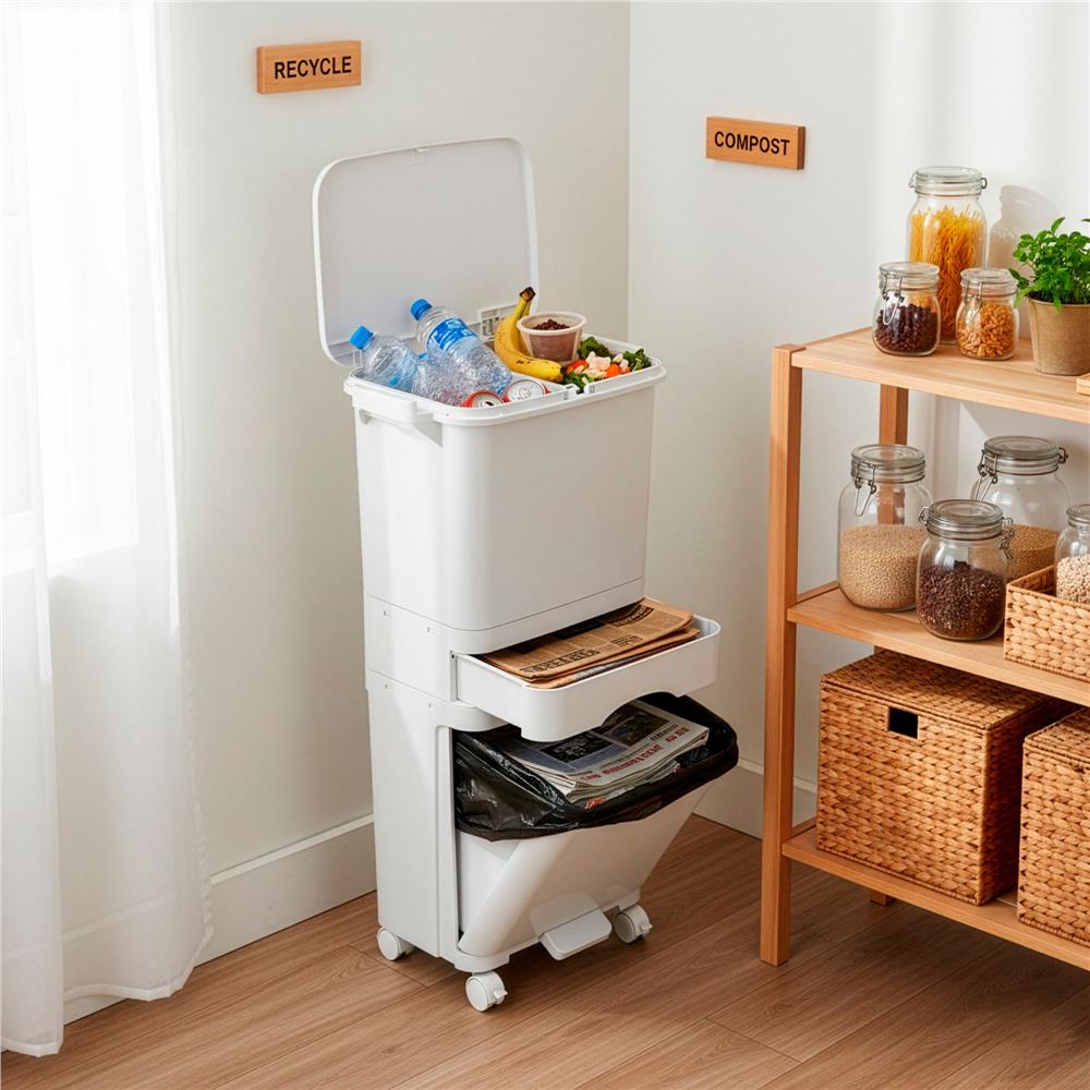 Utilizare: este potrivit pentru colectarea selectivă a plasticului, hârtiei și deșeurilor menajere în locuință sau la birou. Se recomandă amplasarea într-o zonă ușor accesibilă, iar după asamblare poate fi mutat rapid cu ajutorul roților.