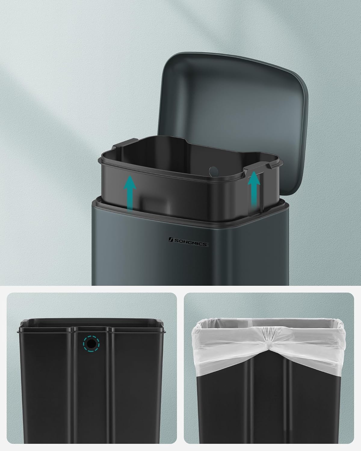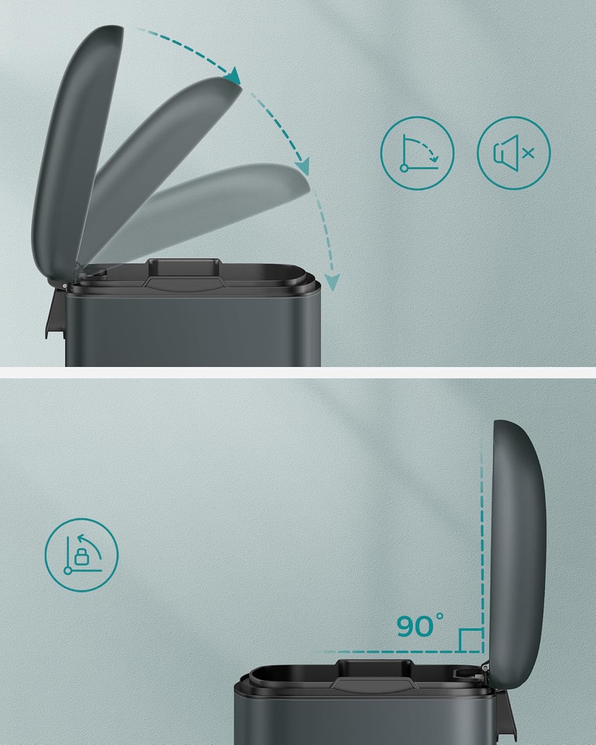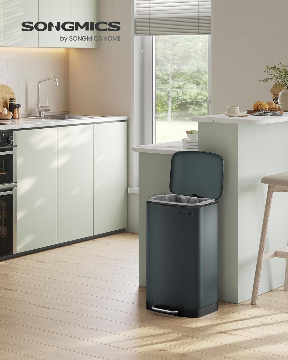 Alege un cos de gunoi cu pedala 30L practic si elegant, potrivit pentru bucatarie, living sau alte spatii interioare. Modelul SONGMICS imbina un design modern, in nuanta verde-gri, cu functii utile pentru o utilizare zilnica mai igienica si mai confortabila. Deschiderea cu pedala iti permite sa arunci rapid deseurile fara sa atingi capacul, iar sistemul soft-close asigura o inchidere lina si silentioasa.