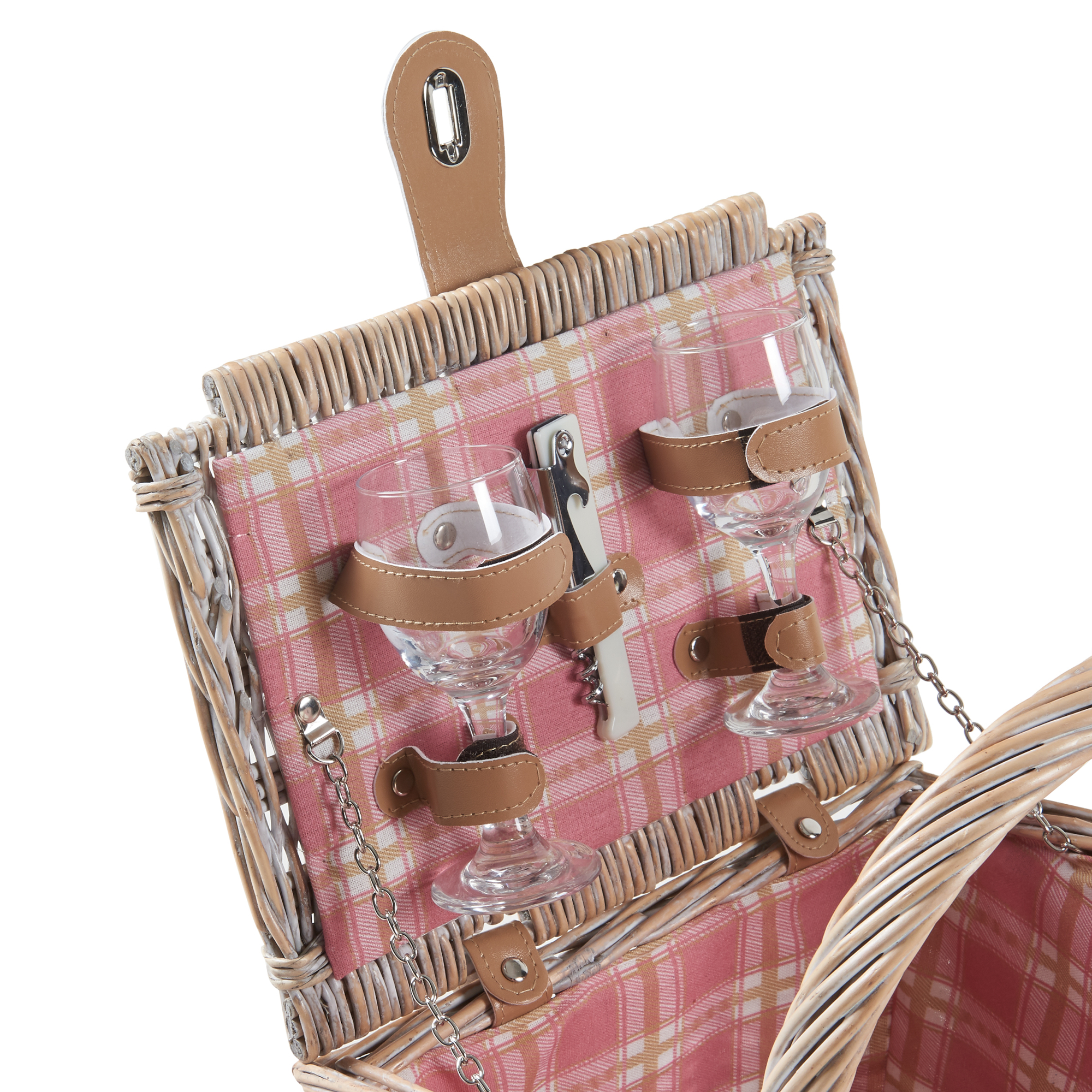 În interior, vei găsi tot ce ai nevoie pentru un picnic reușit: farfurii, pahare, tacâmuri, tirbușon și o pătură de picnic asortată. Fiecare piesă este fixată în suporturi speciale, pentru transport sigur și organizare eficientă. În plus, coșul oferă suficient spațiu pentru gustări, fructe, băuturi și alte provizii.