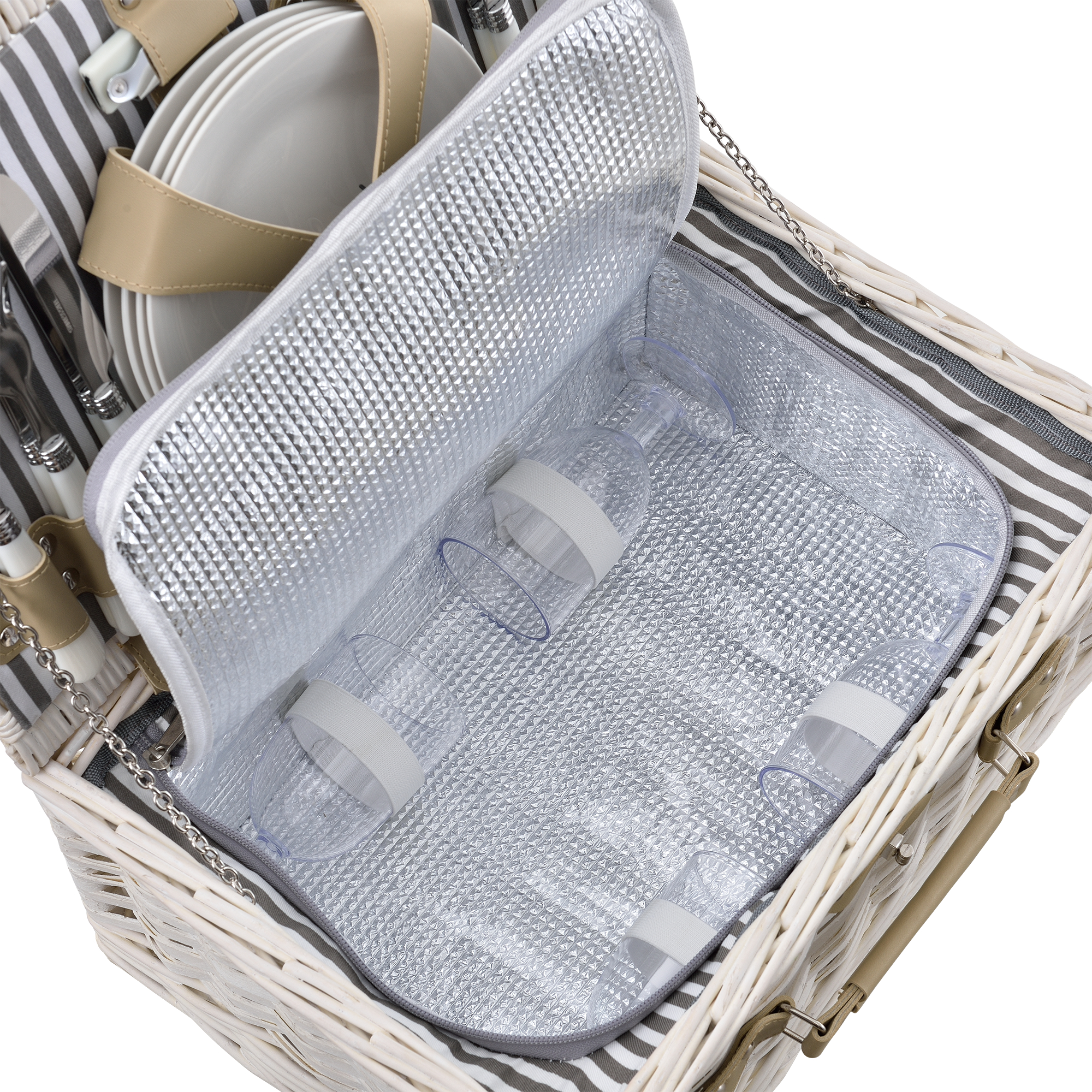 Practic și bine organizat, coșul include veselă, tacâmuri, pahare, tirbușon și recipiente pentru sare și piper. Compartimentul termoizolant ajută la păstrarea gustărilor și băuturilor la o temperatură potrivită pentru mai mult timp.