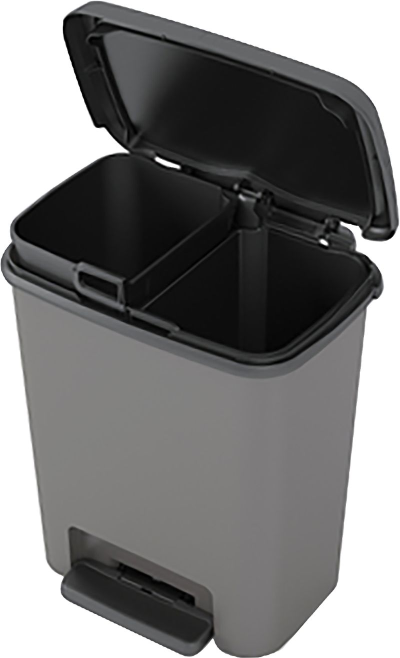 Prevăzut cu două compartimente interioare de câte 11 litri, acest coș de gunoi pentru reciclare te ajută să separi simplu diferite tipuri de deșeuri. Pedala permite deschiderea igienică fără atingere, iar recipientele interioare cu mânere pot fi scoase rapid pentru golire și curățare ușoară.