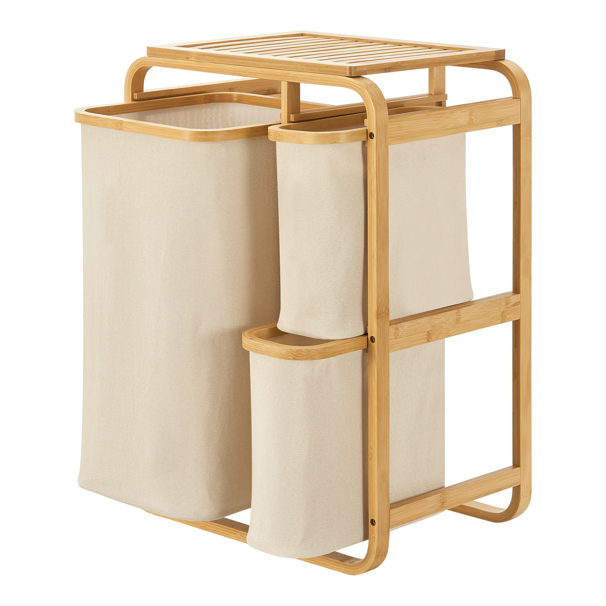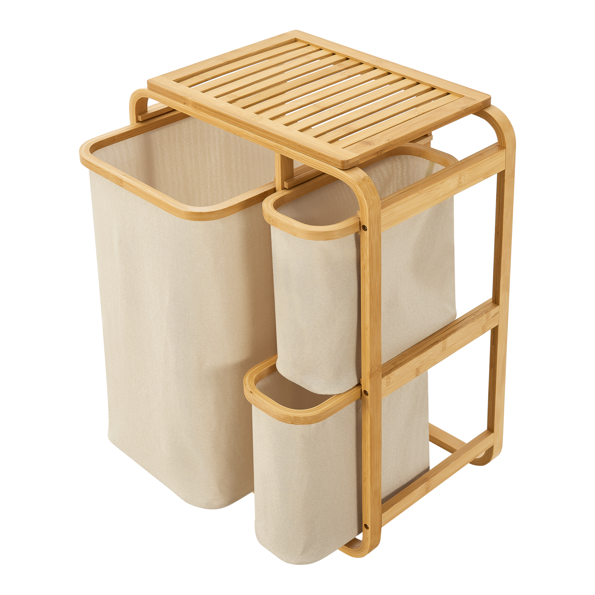 Coș de rufe cu 3 compartimente și raft superior din bambus, bej