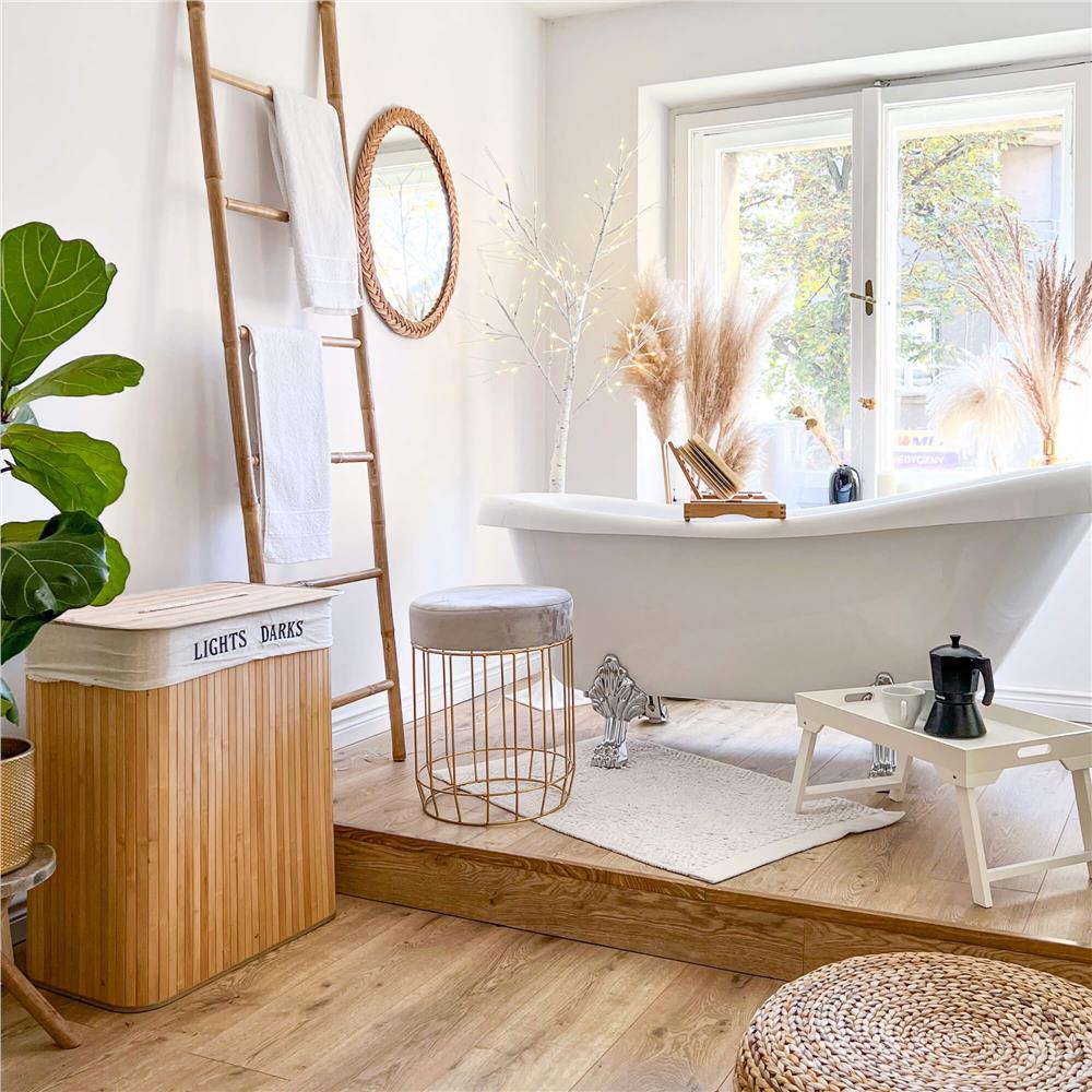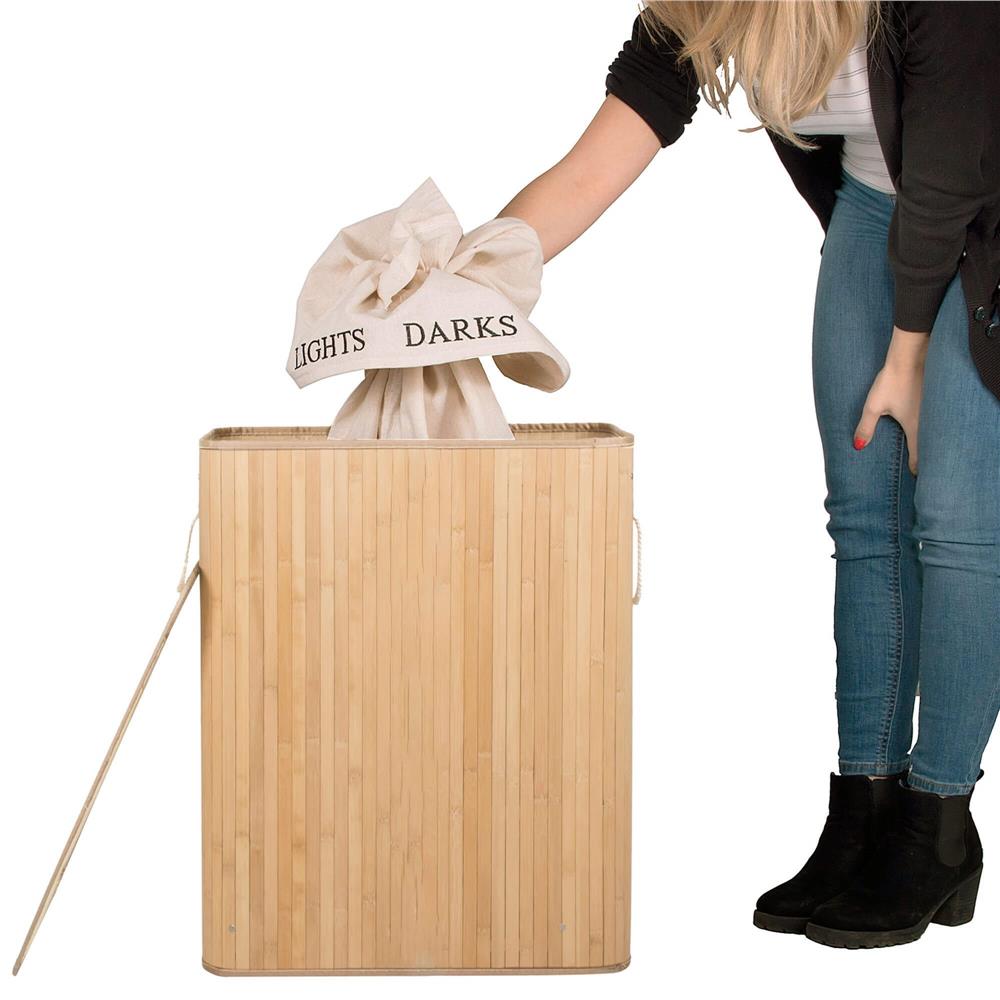 Sacul textil interior este detașabil, astfel încât manipularea și transportul rufelor devin mai simple. Capacitatea generoasă de 105 litri îl face potrivit pentru utilizare zilnică în locuințe de familie, iar construcția din bambus și MDF oferă un bun echilibru între rezistență și estetică.