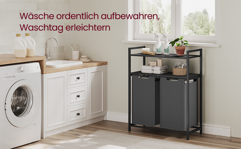 Cei 2 saci detașabili sunt prevăzuți cu prindere Velcro și pot fi scoși rapid pentru a transporta rufele direct la mașina de spălat. Materialul textil Oxford este hidrofug, iar structura din oțel și MDF oferă stabilitate și rezistență în utilizarea de zi cu zi. Rafturile cu lamele susțin o bună circulație a aerului, ajutând la reducerea mirosurilor neplăcute.