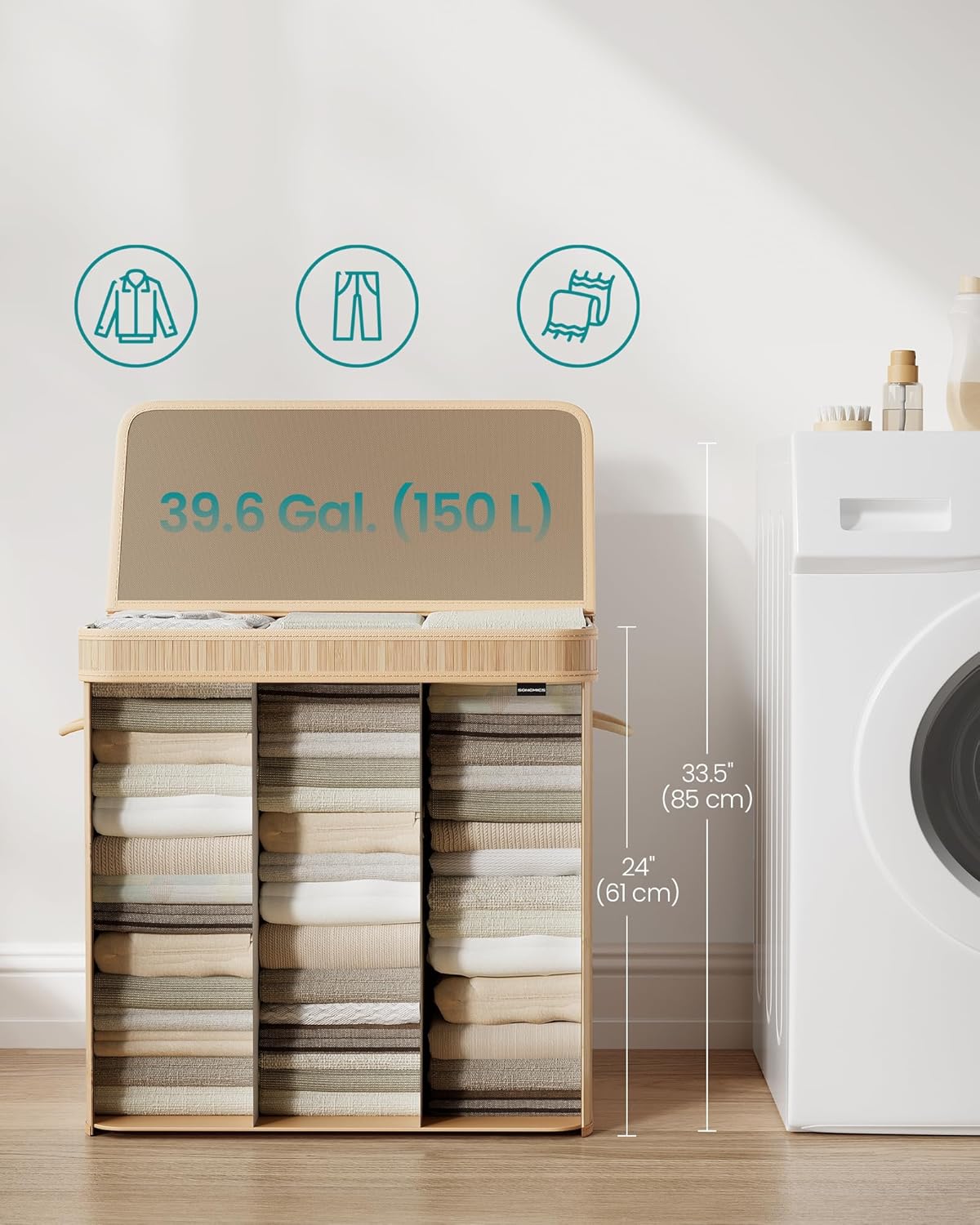 Cos de rufe SONGMICS 150L pliabil cu capac si sac lavabil, bambus bej