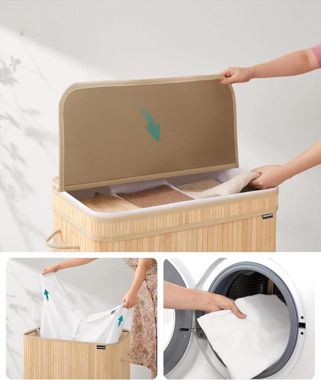 Alege un cos de rufe 150L practic si elegant pentru organizarea eficienta a hainelor murdare. Modelul SONGMICS din bambus imbina aspectul natural cu functionalitatea de zi cu zi, fiind potrivit pentru baie, dormitor sau camera de rufe. Capacul pastreaza continutul discret, iar sacul interior detasabil face transportul si spalarea mult mai usoare.