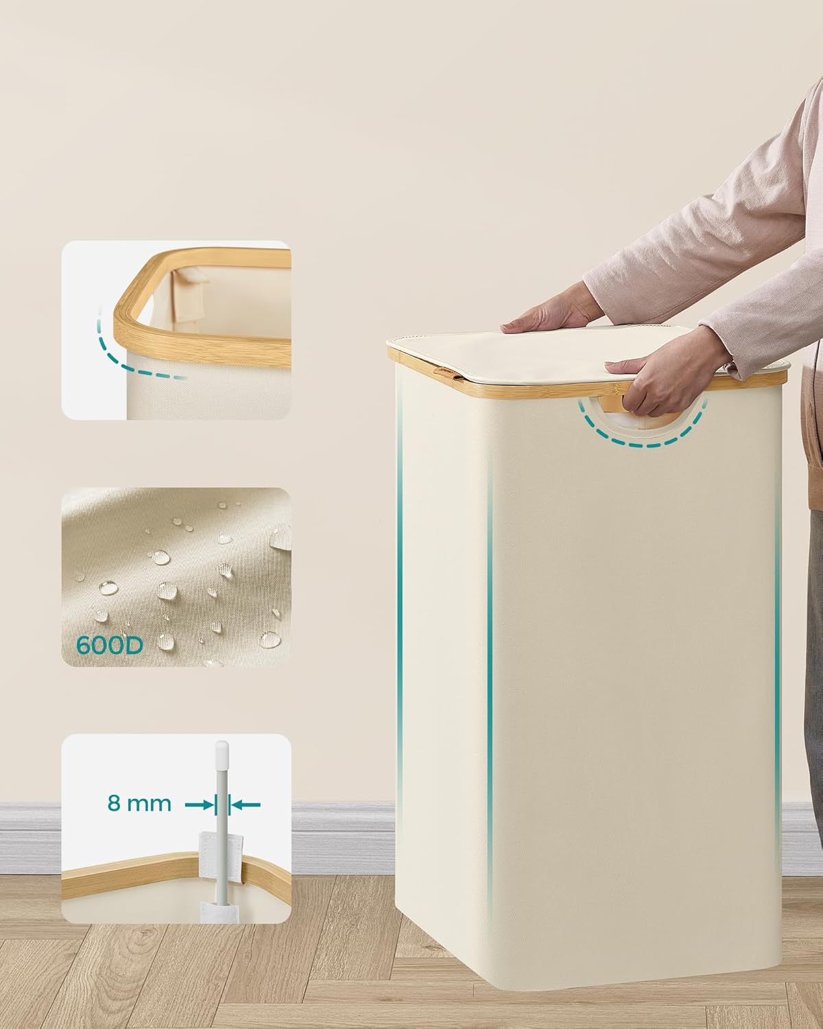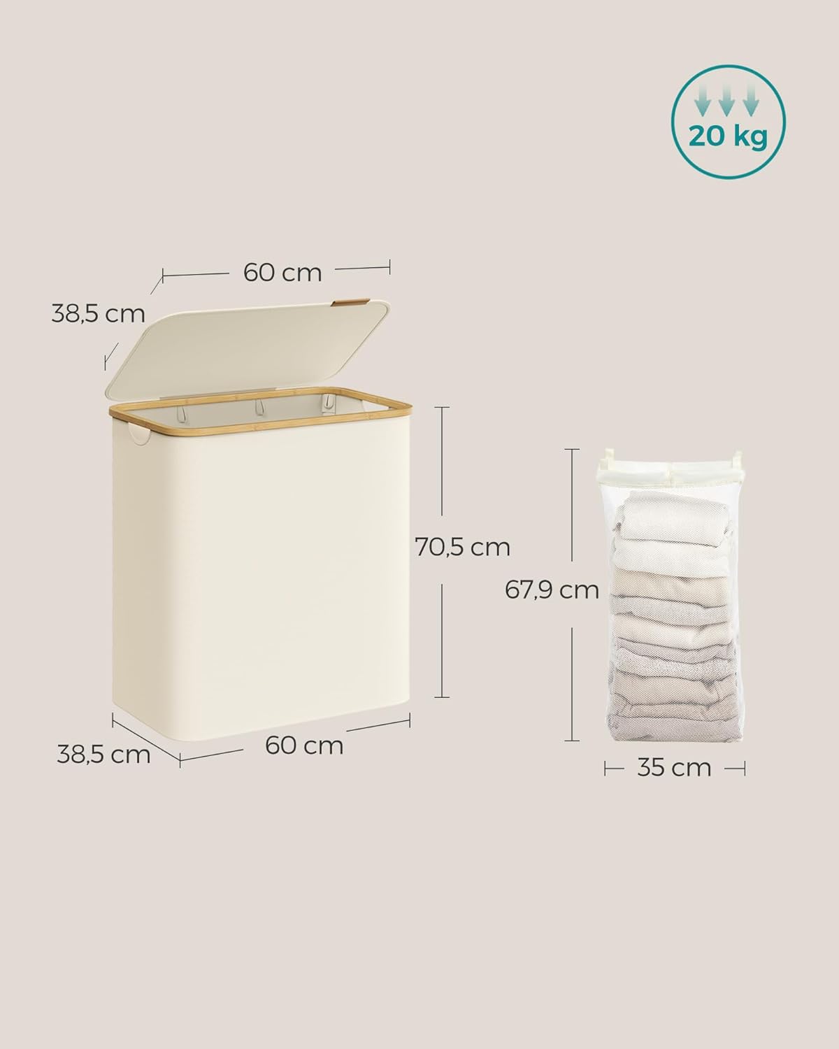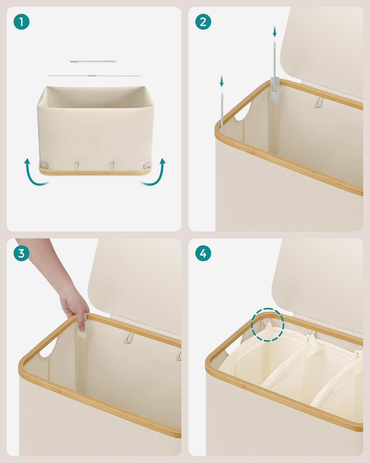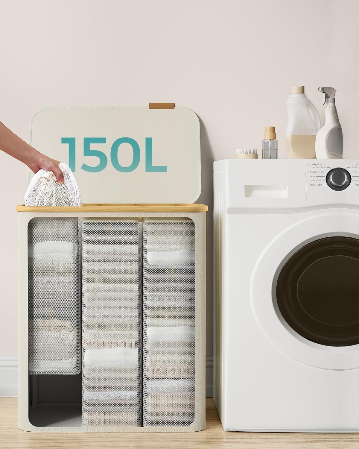 Păstrează hainele organizate cu acest coș de rufe textil SONGMICS, conceput pentru sortare rapidă și utilizare comodă în fiecare zi. Cu o capacitate generoasă de 150L și 3 compartimente detașabile, este ideal pentru separarea hainelor albe, colorate sau delicate încă din momentul depozitării. Designul slim, culoarea crem și detaliile din bambus îl fac potrivit pentru baie, dormitor sau spălătorie.