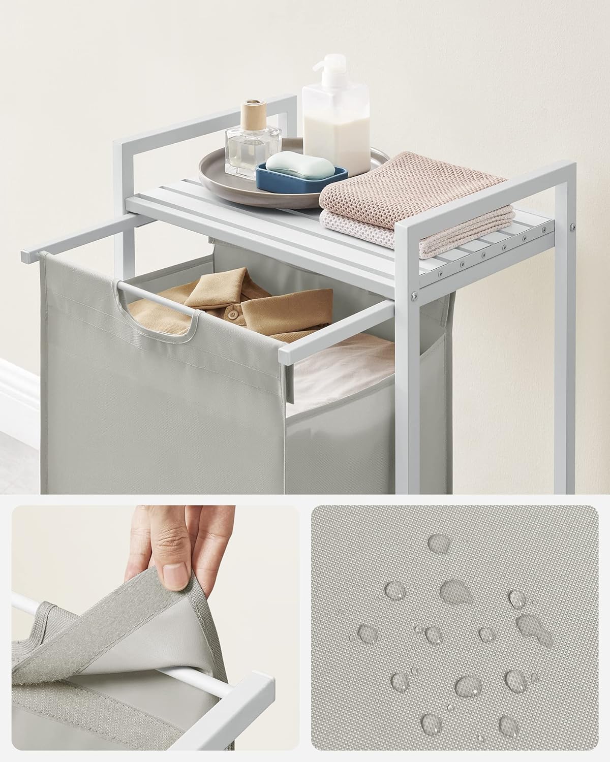 Poate fi folosit în baie, dormitor, dressing sau camera de spălat. Depozitezi rufele în sacul textil, iar pe raft poți păstra produsele necesare pentru spălare sau obiectele de uz zilnic. Este o soluție practică pentru menținerea ordinii într-un spațiu restrâns.