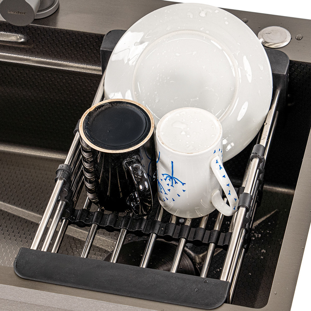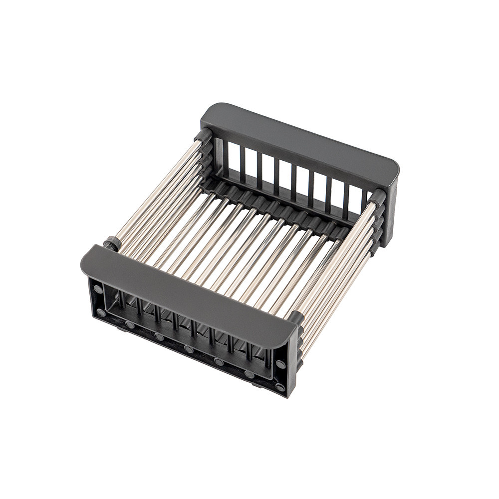 Se așază direct peste chiuvetă, economisind spațiu pe blat și făcând curățenia mai simplă. Picioarele/elementele antiderapante oferă stabilitate, iar finisajul negru se potrivește discret în majoritatea bucătăriilor.