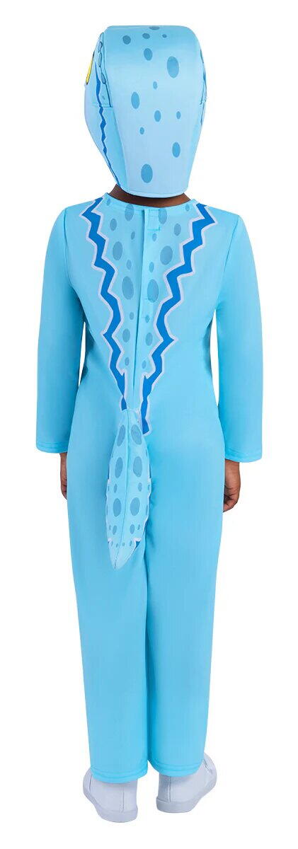 Designul include o salopeta completa cu gluga tip cap de dinozaur si coada atasata, oferind un look realist si simpatic in acelasi timp