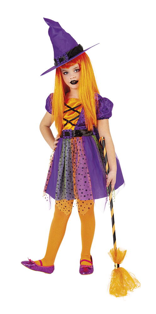 Tinuta este completata de o palarie de vrajitoare, perfect asortata cu rochita, realizata din acelasi material mov