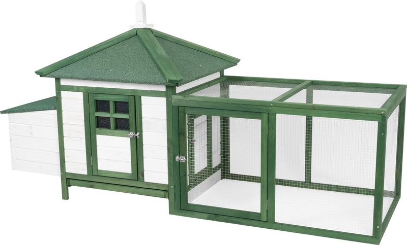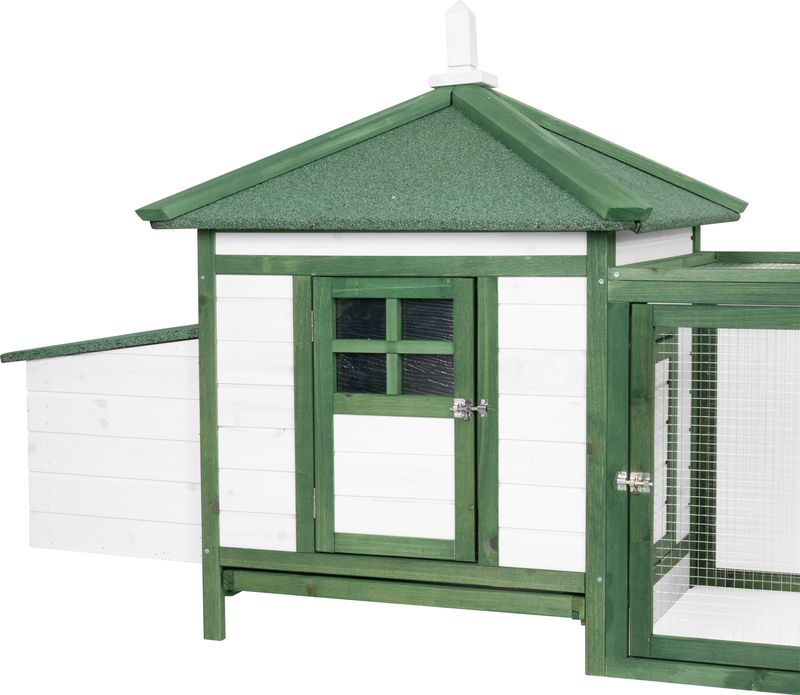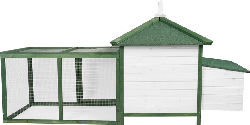 Designul său oferă un bun echilibru între protecție, accesibilitate și spațiu util, fiind potrivit pentru gospodării care au nevoie de un coteț pentru găini cu cuib de ouat și zonă de plimbare integrată.