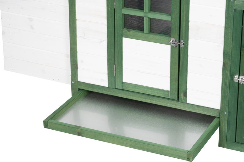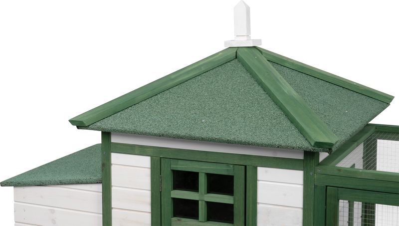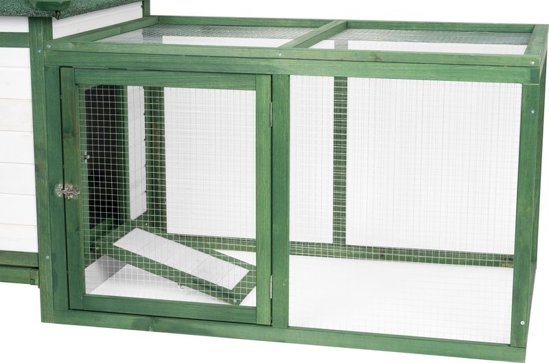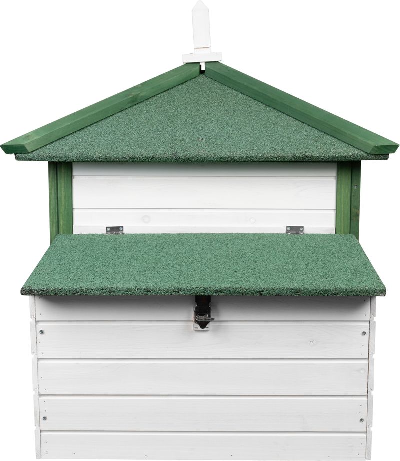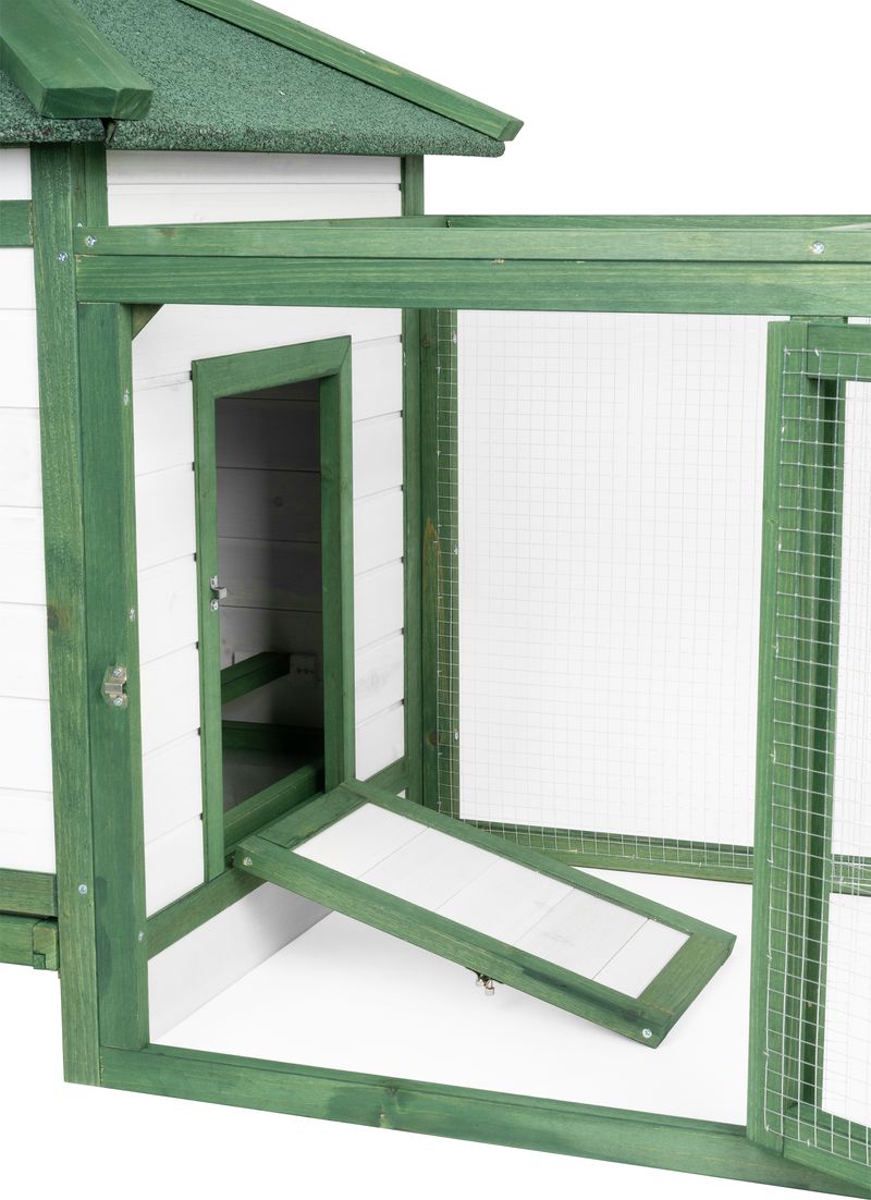 Construcția este gândită pentru utilizare ușoară în gospodărie: acoperișul rabatabil permite acces facil la interior pentru curățare și colectarea ouălor, iar rampa de acces asigură trecerea în siguranță între zona de adăpost și cea de mișcare. Este alegerea potrivită pentru crescătorii care caută un coteț de exterior compact, funcțional și ușor de întreținut.