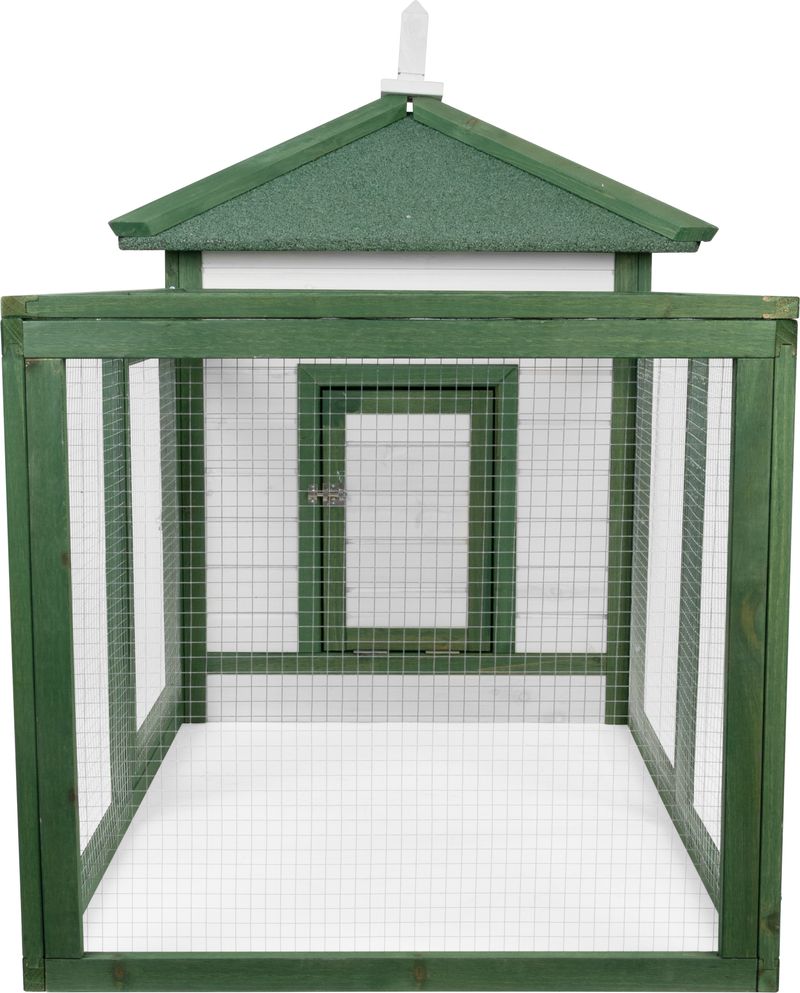 - Construcție în două zone: căsuță închisă și țarc din plasă metalică