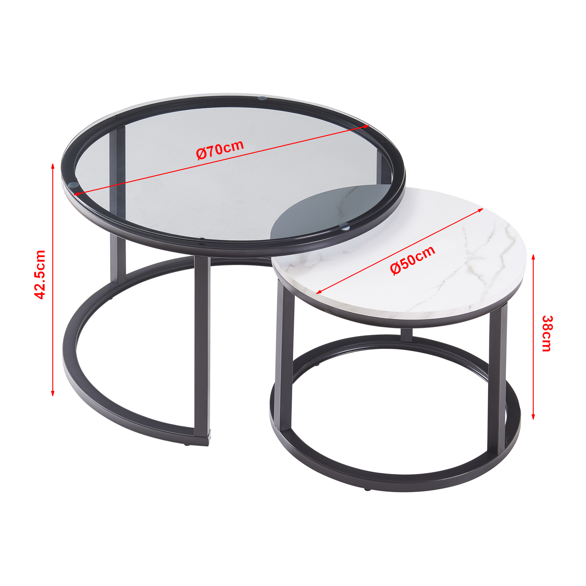 Die unterschiedlichen Höhen der beiden Tische schaffen nicht nur ein ansprechendes Erscheinungsbild, sondern ermöglichen es Ihnen auch, sie bei Bedarf platzsparend zusammenzuführen. So können Sie Ihren Raum optimal nutzen und flexibel gestalten.