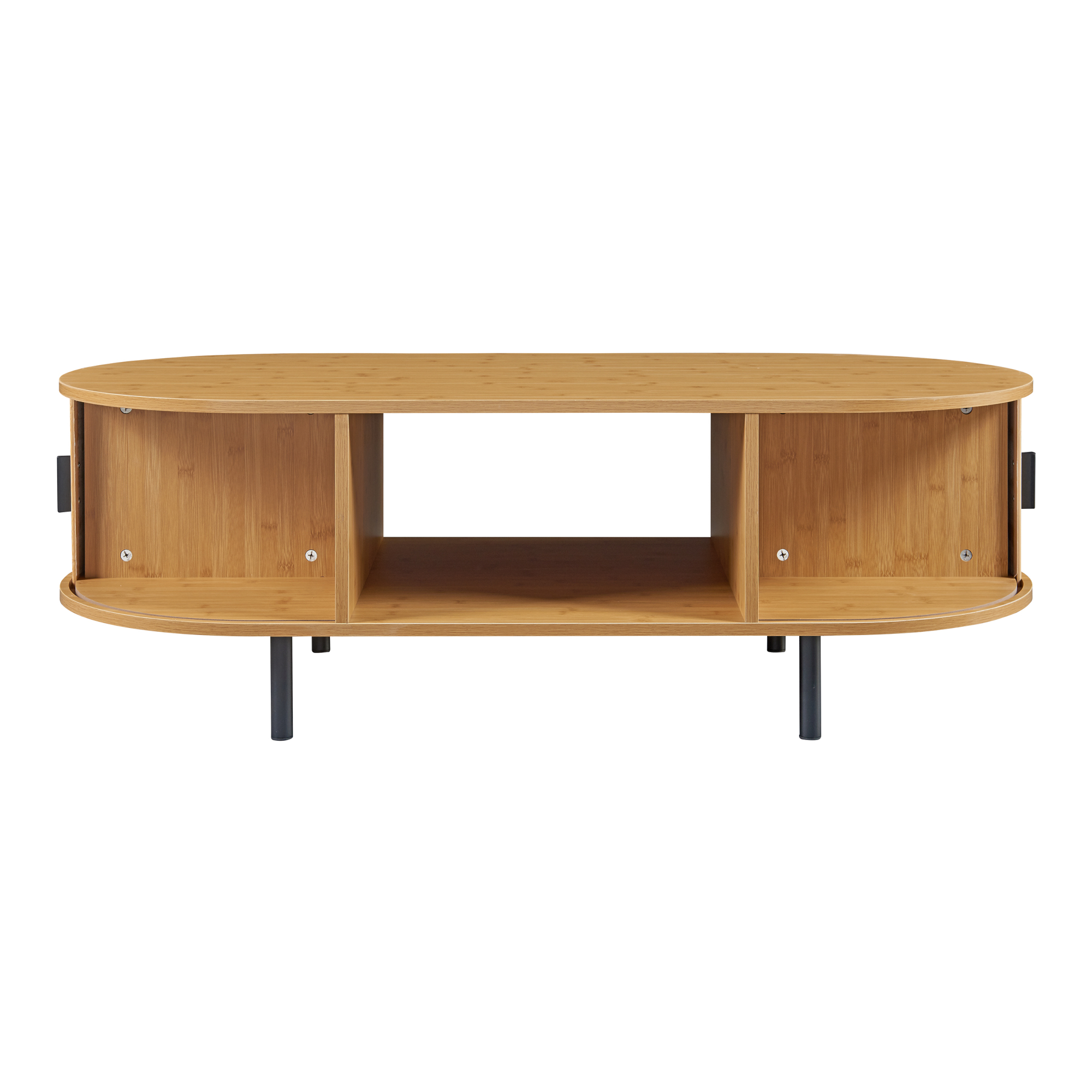 Der durchdachte Korpus offenbart großzügigen Stauraum im Inneren des Tisches. Die Vorderseite präsentiert sich mit zwei eleganten Schiebetüren, welche je ein halbrundes Ablagefach verbergen. Auf der Rückseite finden sich zwei weitere offene, halbrunde Ablagefächer, während in der Mitte des Tisches ein durchgehendes, offenes Ablagefach für zusätzlichen Stauraum sorgt.