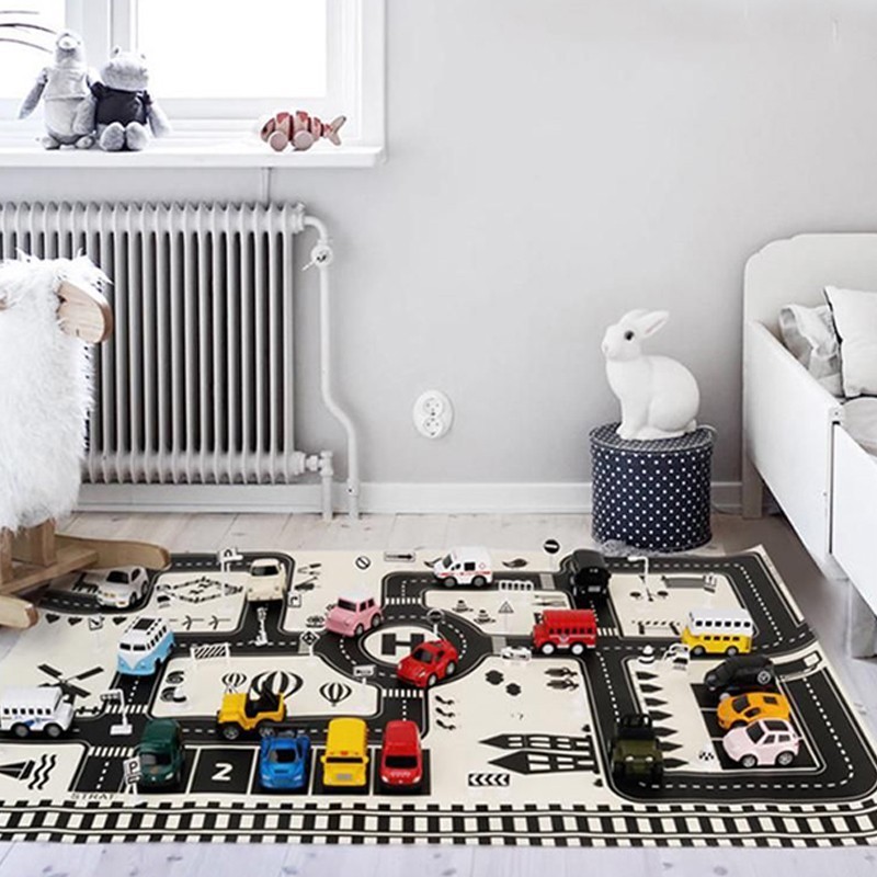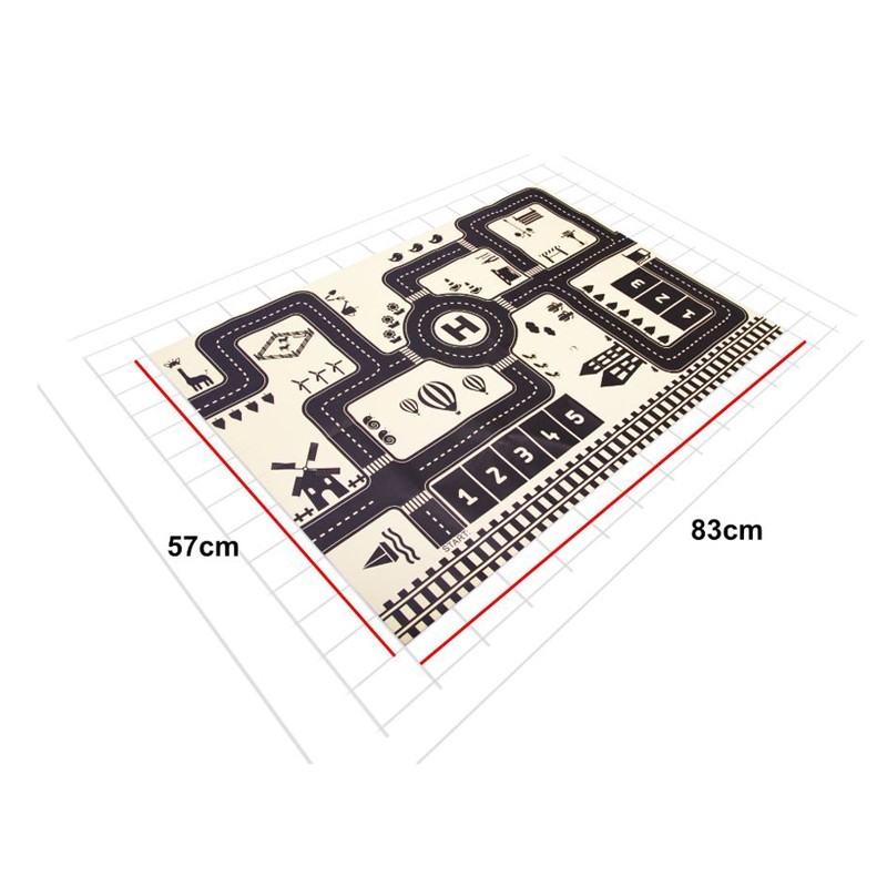 Covorasul pentru copii cu imprimeu de pista auto este un accesoriu ideal pentru joaca, care aduce distractie si functionalitate in orice camera. Avand dimensiunile de 83x57 cm, acest covoras este suficient de compact pentru a se incadra perfect in spatii mai mici, dar destul de mare pentru a oferi copiilor o suprafata generoasa de joaca. Designul alb-negru cu pista auto stimuleaza imaginatia si creativitatea copiilor, incurajand jocurile de rol si dezvoltarea abilitatilor motorii.