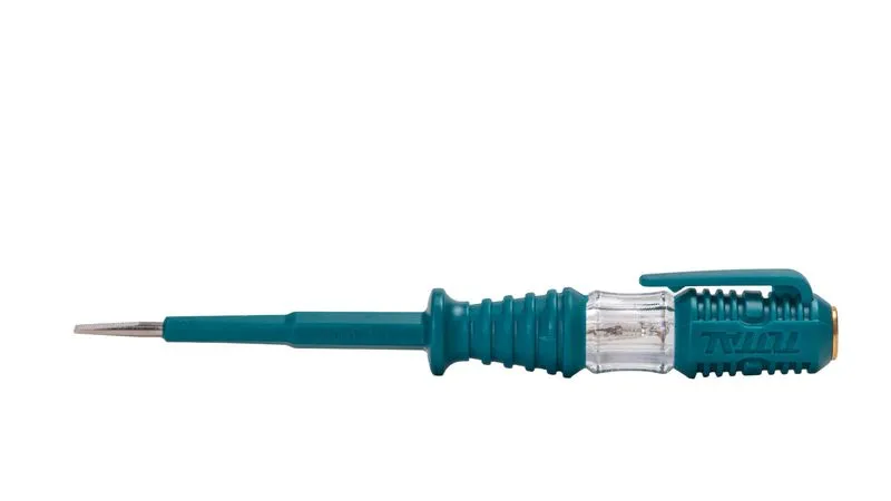 Creionul de tensiune Total de 140 mm este un tester de tensiune simplu și eficient, perfect pentru verificări rapide în casă sau pe șantier. Te ajută să depistezi ușor faza și prezența tensiunii la prize, întrerupătoare și cabluri, fără bătăi de cap.