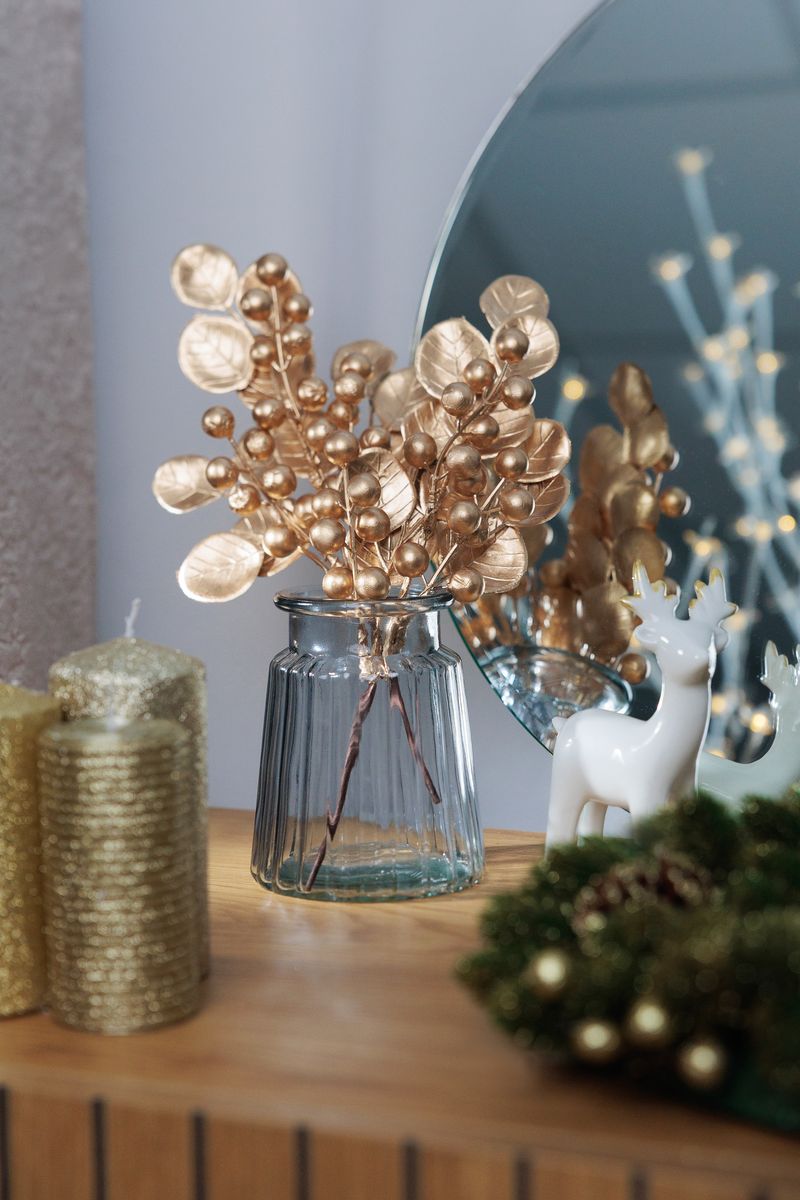 Aspectul său festiv, completat de bobițele aurii și frunzele decorative, aduce o atmosferă caldă și luxoasă în casă, birou sau spații comerciale. Datorită dimensiunii practice, este potrivită pentru multiple stiluri de amenajare, de la clasic la modern.