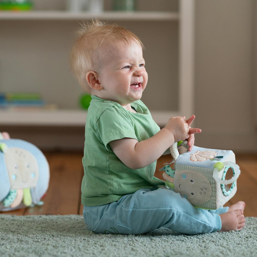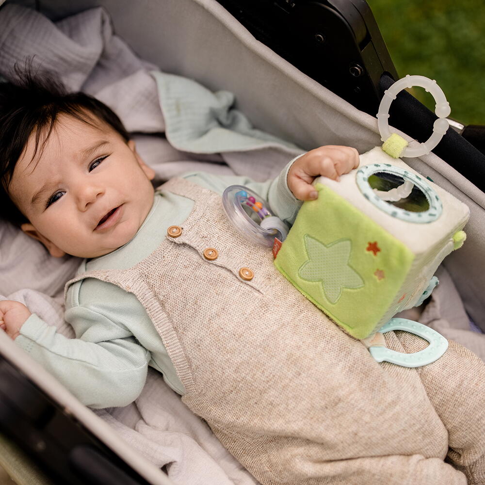 Prinde jucaria cu ajutorul inelului rezistent de carucior, scaun auto sau patut, astfel incat bebelusul sa o poata atinge, agita si explora in siguranta. Elementele interactive il incurajeaza sa descopere sunete, forme si texturi diferite, dezvoltandu-si coordonarea si curiozitatea.