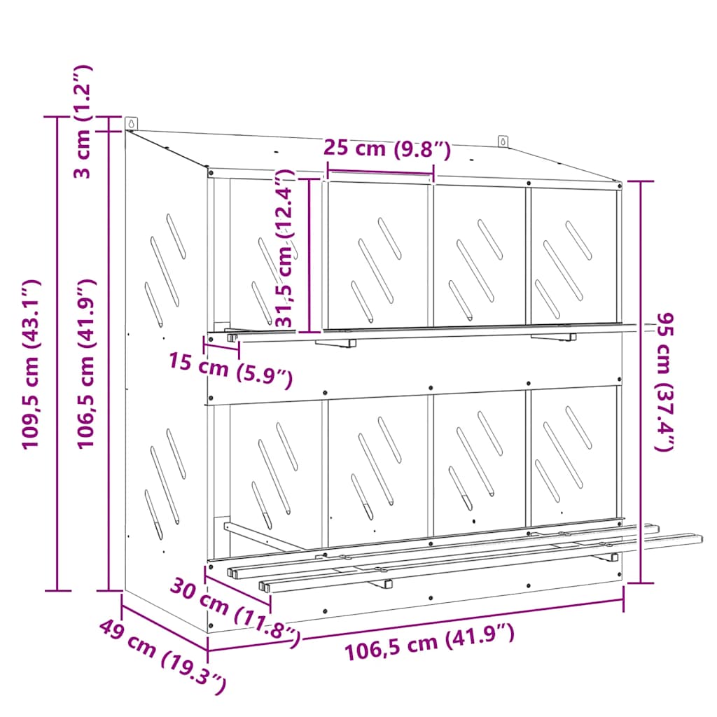 - Dimensiunile fiecărei încăperi de cuibărit de jos: 25 x 49 x 46,5 cm (l x a x h)