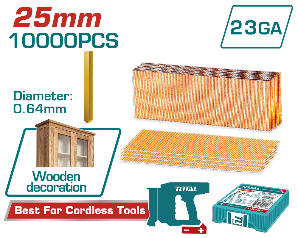 Obține prinderi curate și rapide cu cuiele TOTAL de 25 mm, concepute pentru lucrări de finețe în mobilier, rame, lambriu sau alte materiale ușoare. Sunt realizate din oțel zincat pentru o rezistență mai bună la coroziune și sunt compatibile cu pistolul de bătut cuie TOTAL TCBNLI3606.