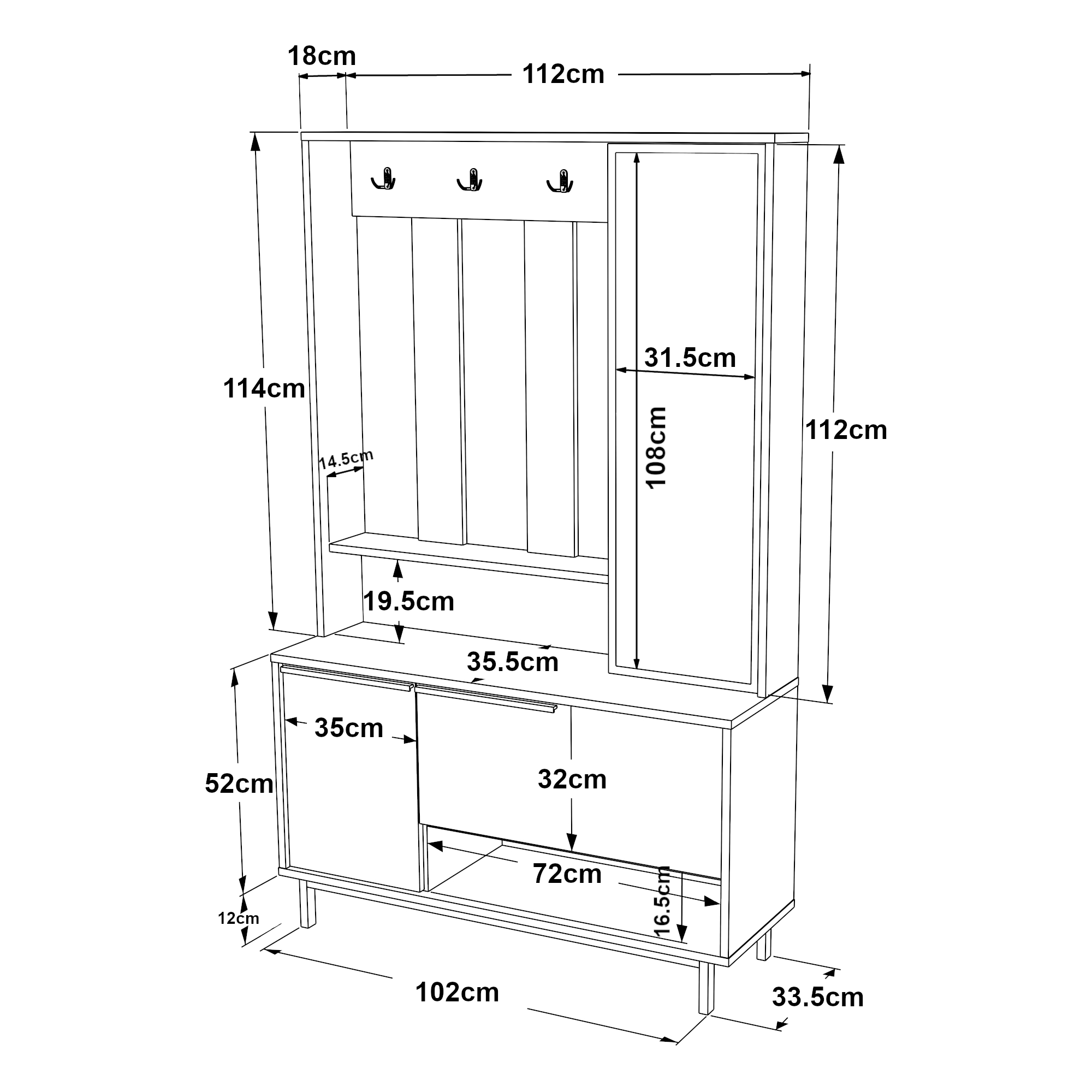 Acest cuier de hol cu oglindă îți oferă atât funcționalitate, cât și un plus de stil. Cele 5 cârlige duble sunt ideale pentru geci, paltoane, eșarfe sau cămăși, iar ușa cu oglindă permite verificarea rapidă a ținutei înainte de plecare. În partea de jos, dulapul, compartimentul rabatabil și polița deschisă oferă spațiu util pentru încălțăminte, genți sau alte obiecte de zi cu zi.