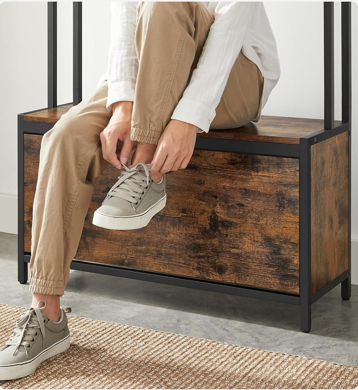 Transforma intrarea intr-un spatiu ordonat si primitor cu acest cuier de hol cu dulap pentru pantofi VASAGLE. Conceput pentru organizare eficienta, modelul combina intr-o singura piesa un cuier metalic, o banca pentru hol, un dulap pentru pantofi cu usa rabatabila si un raft superior pentru decoratiuni sau accesorii. Finisajul maro rustic si cadrul din otel negru completeaza perfect un decor in stil industrial.