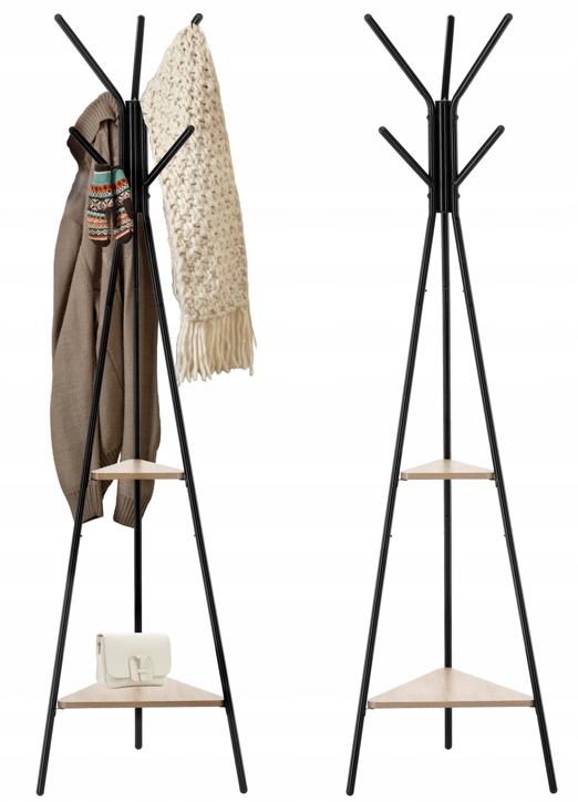 Cuier de hol metalic cu 2 rafturi MDF, design minimalist, 180 cm, negru