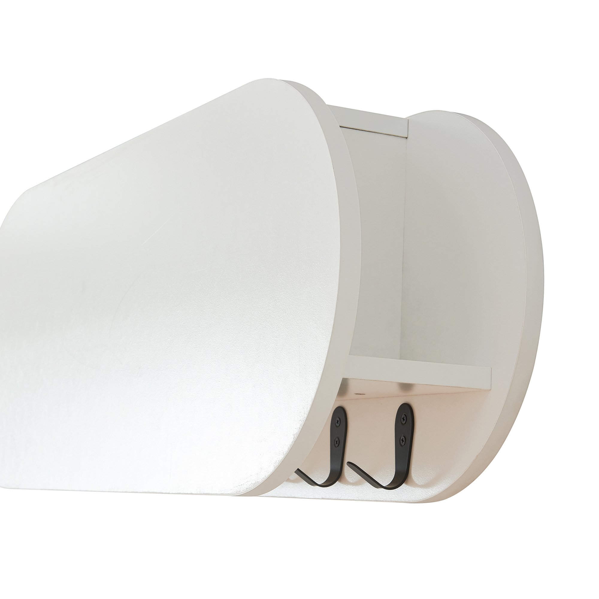 Prevăzut cu 6 cârlige metalice, acest cuier de perete alb este ideal pentru agățarea gecilor, genților, umbrelor sau eșarfelor. În partea superioară dispune de un raft decorativ, perfect pentru plante, rame foto sau mici obiecte decorative, iar compartimentele laterale deschise oferă acces rapid la accesorii frecvent folosite.
