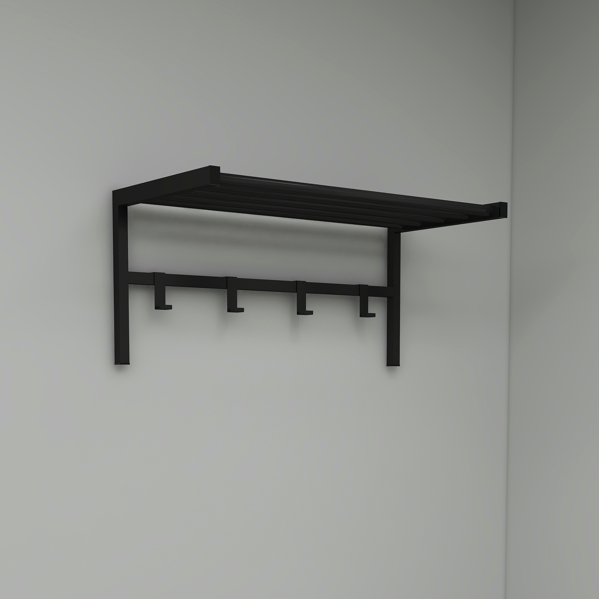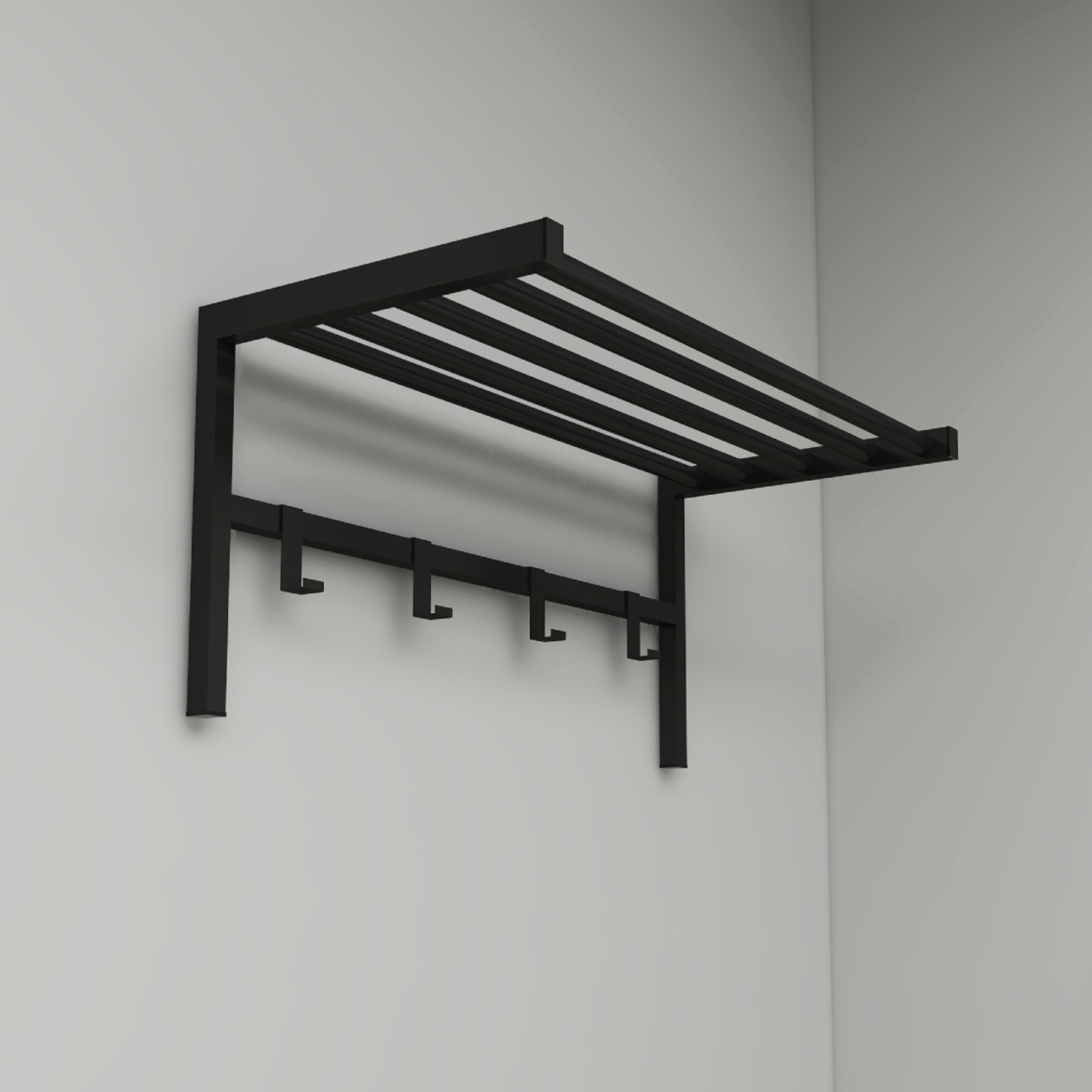 Cuier de perete Tolga cu raft este o alegere practica si eleganta pentru hol, dressing sau birou. Acest cuier de perete in finisaj negru ajuta la organizarea eficienta a hainelor si accesoriilor, economisind spatiu si oferind un aspect modern incaperii.