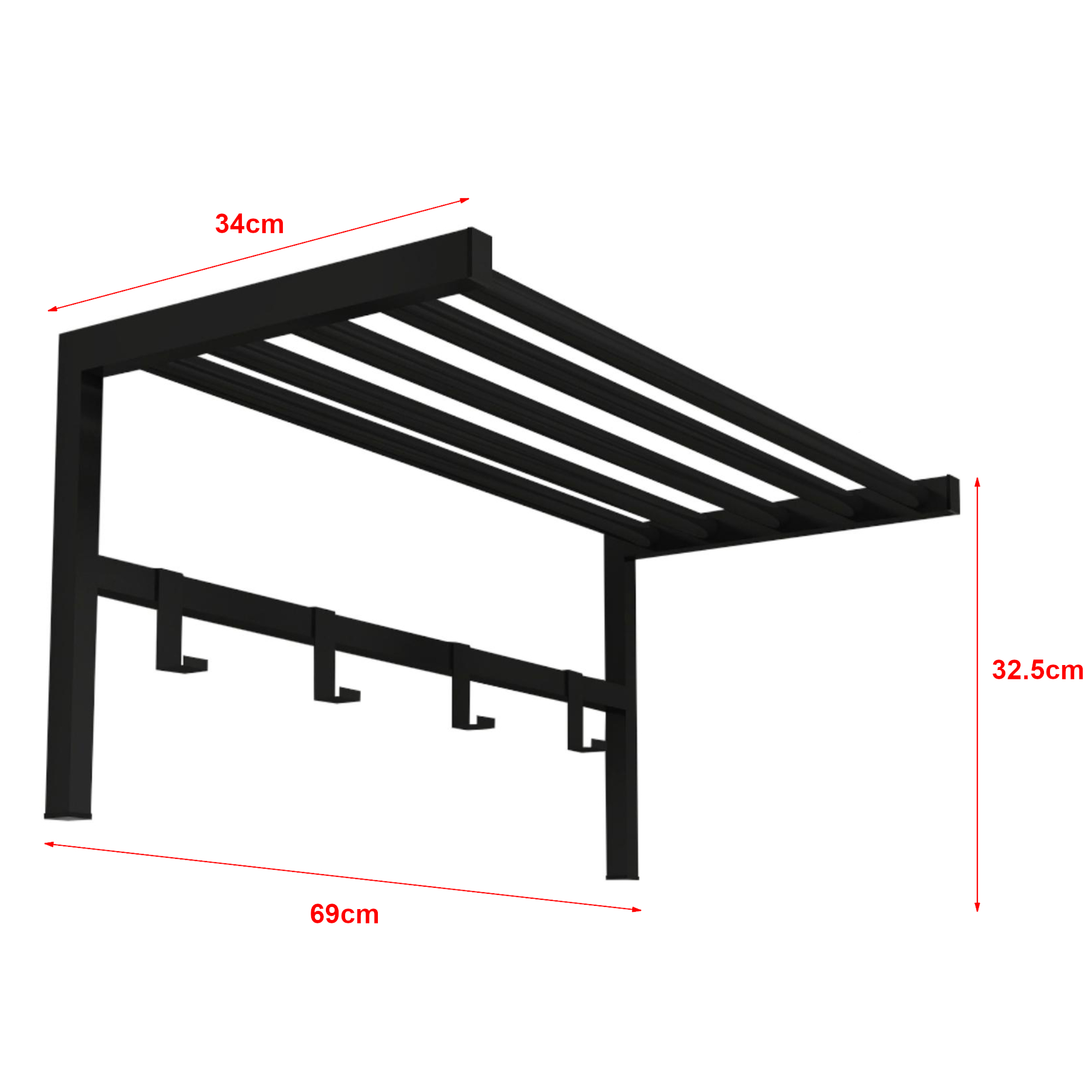 Prevazut cu 4 carlige pentru haine, produsul este potrivit pentru jachete, genti, umbrele, palarii sau alte obiecte de zi cu zi. In partea superioara, raftul metalic tip etajera ofera spatiu suplimentar pentru cutii, accesorii sau palarii, iar barele sale pot fi folosite si pentru umerase.