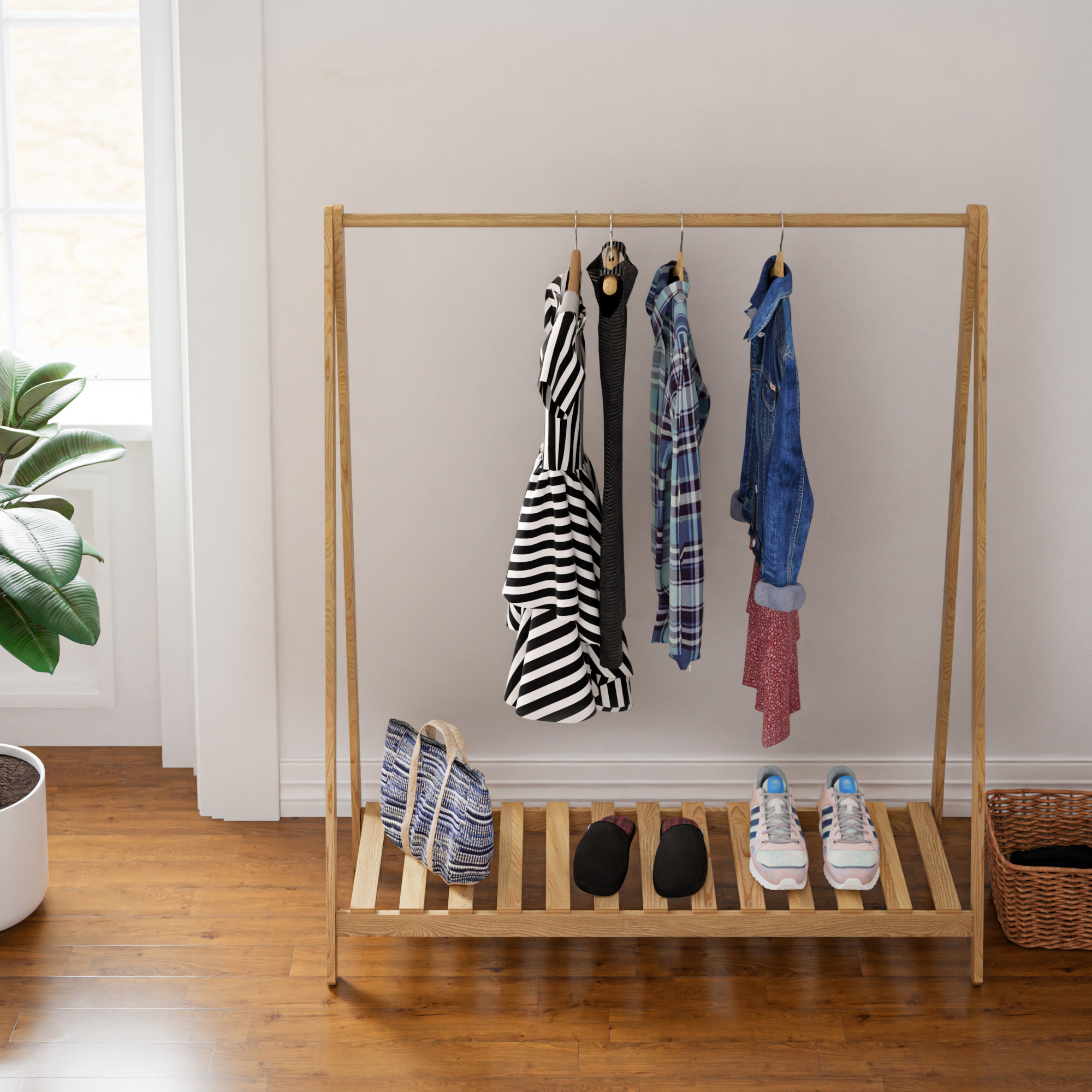 Poate fi folosit ca suport haine în zona de intrare, ca cuier pentru dormitor sau ca piesă practică într-un dressing deschis. Este ideal pentru hainele folosite frecvent, dar și pentru a păstra încălțămintea sau accesoriile bine organizate.