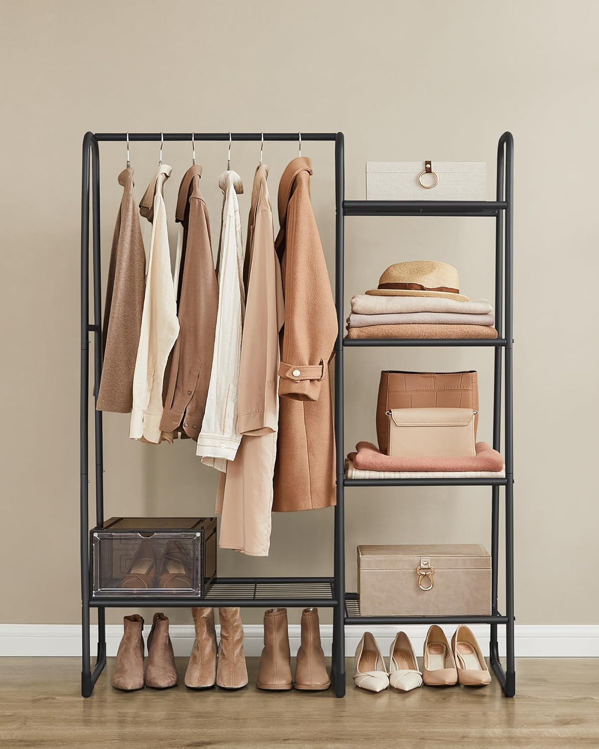 Organizează mai simplu hainele, încălțămintea și accesoriile cu acest cuier metalic cu rafturi SONGMICS, potrivit pentru hol, dormitor sau dressing. Designul său industrial combină o bară pentru haine încăpătoare cu 5 rafturi practice, astfel încât să ai totul la îndemână, într-un spațiu bine ordonat. Structura din oțel oferă stabilitate și rezistență pentru utilizare zilnică.