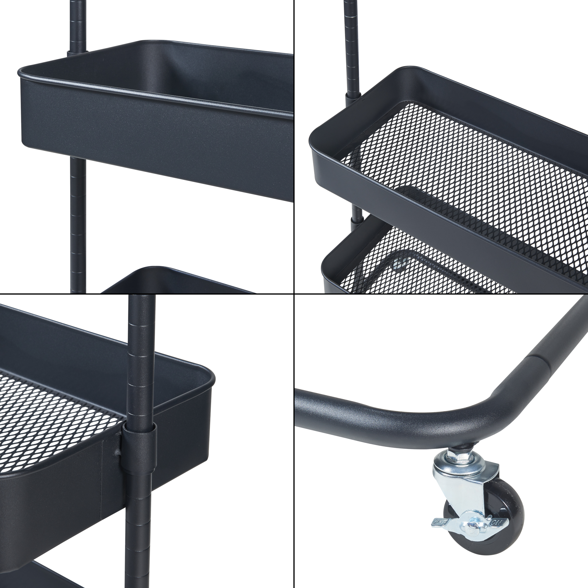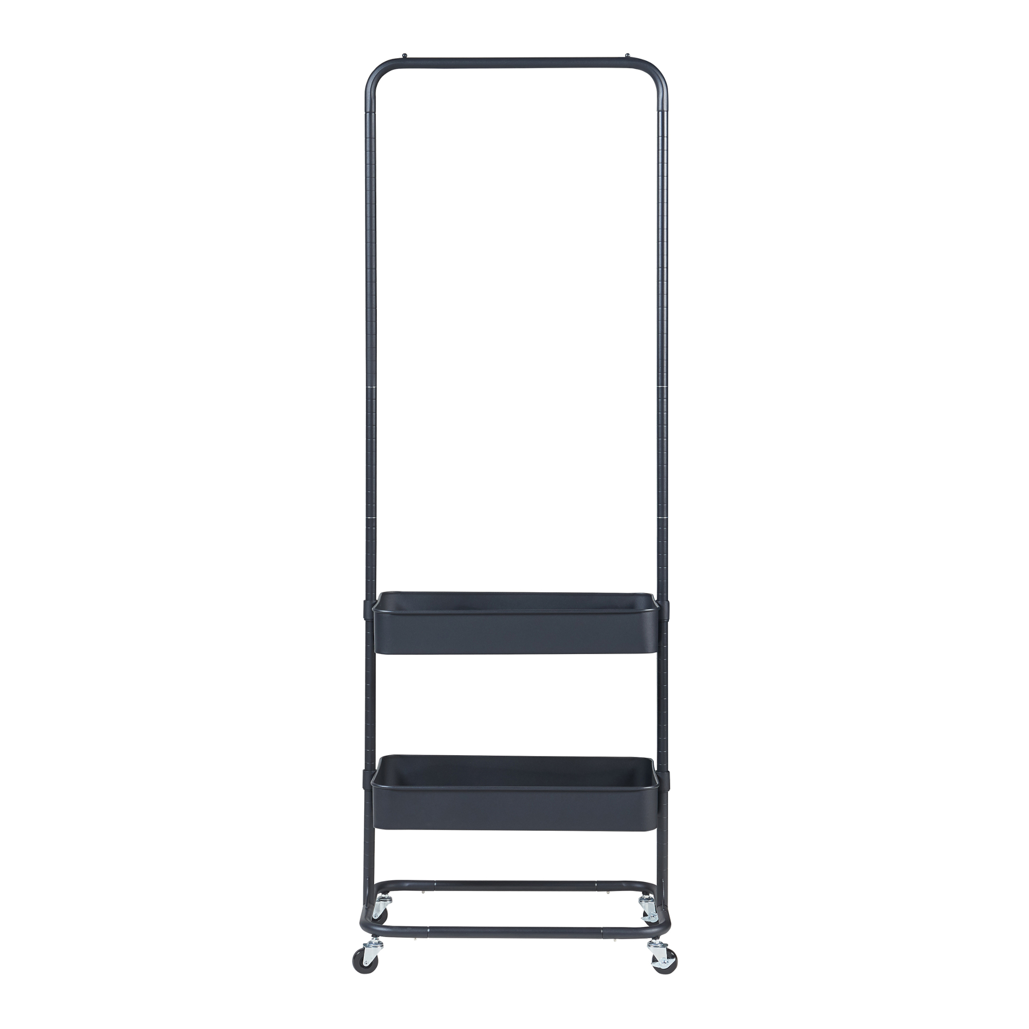 Bara superioara ofera spatiu suficient pentru jachete, paltoane, camasi sau esarfe, iar cele doua cosuri metalice inferioare, reglabile pe inaltime, sunt ideale pentru prosoape, genti, cutii sau alte accesorii. Datorita celor patru roti, acest cuier metalic mobil poate fi mutat usor dintr-o incapere in alta, fara efort. Doua dintre roti sunt prevazute cu frana pentru o pozitionare stabila.