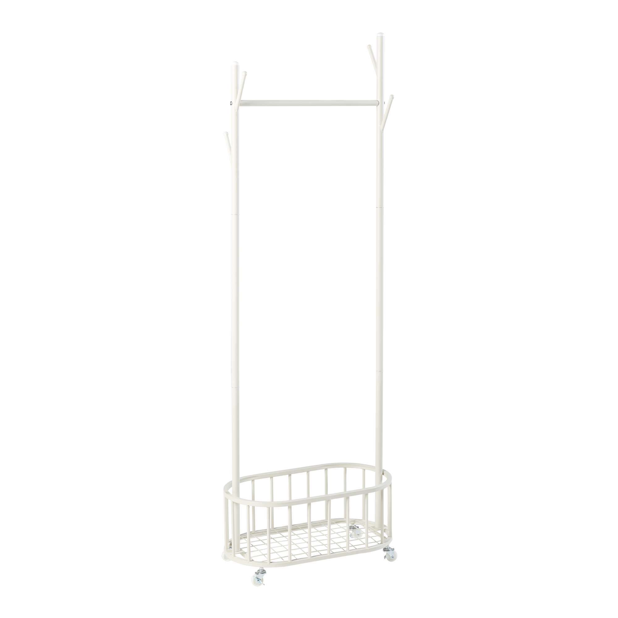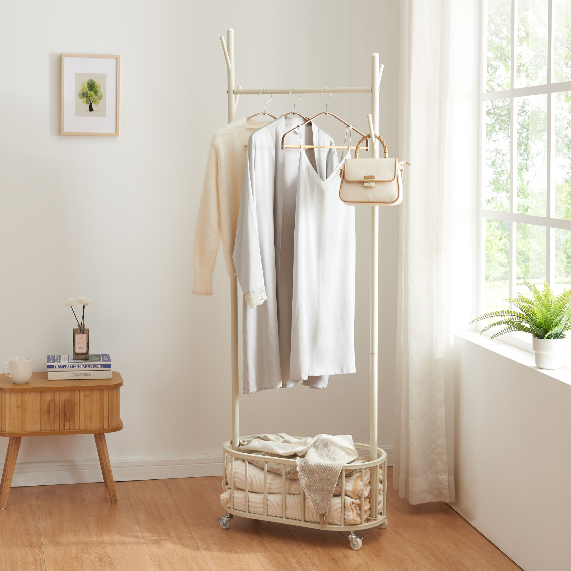 Poate fi folosit ca cuier pentru hol, suport pentru haine în dormitor, organizator pentru dressing sau chiar ca piesă practică într-o cameră de oaspeți. Coșul de la bază este util pentru rufe, prosoape, pături sau alte obiecte textile pe care vrei să le păstrezi ordonat.