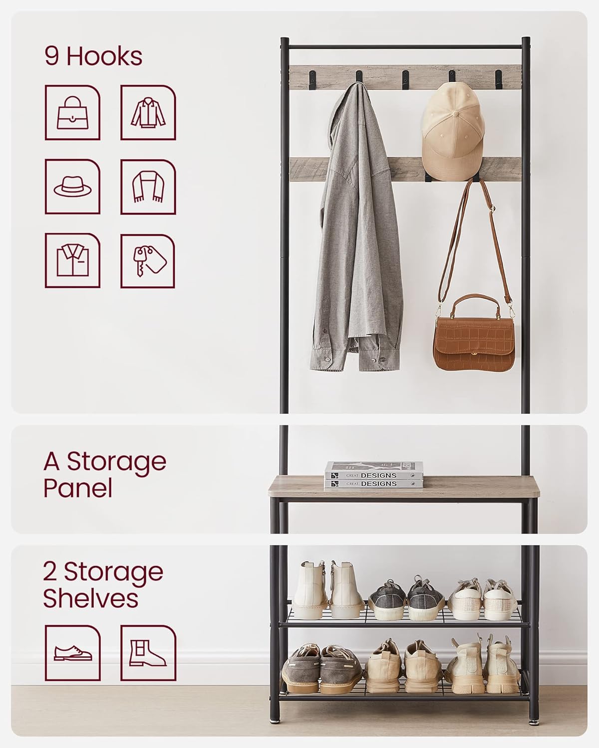 Cuier multifunctional pentru hol VASAGLE, cu banca si 2 rafturi pantofi, 9 carlige, gri-negru, 70x32x175 cm