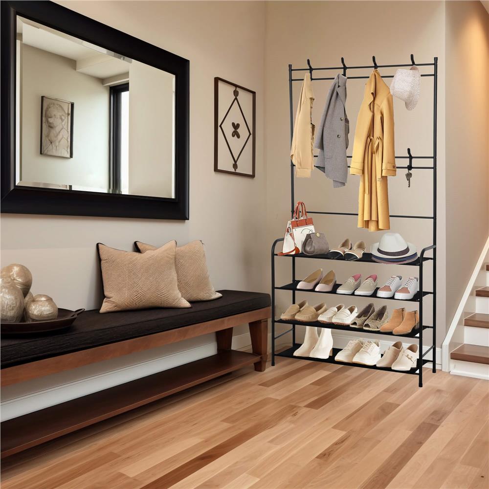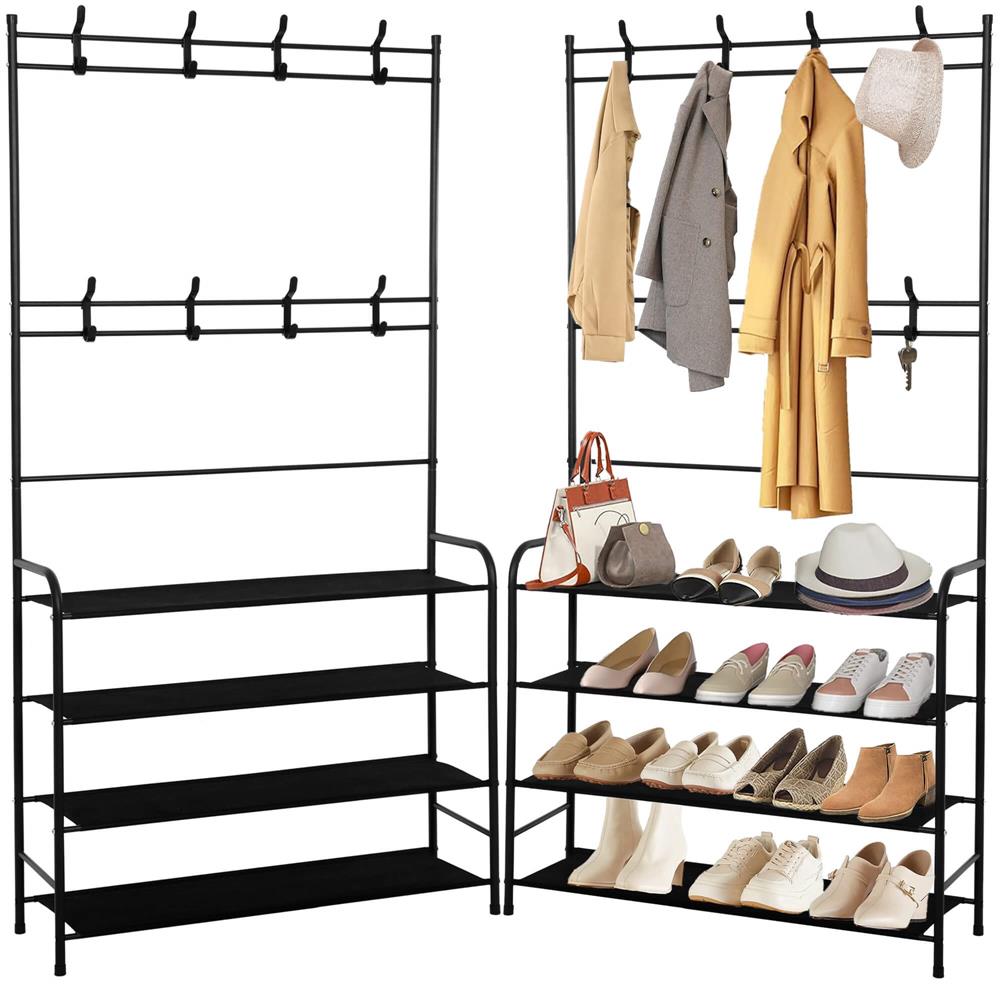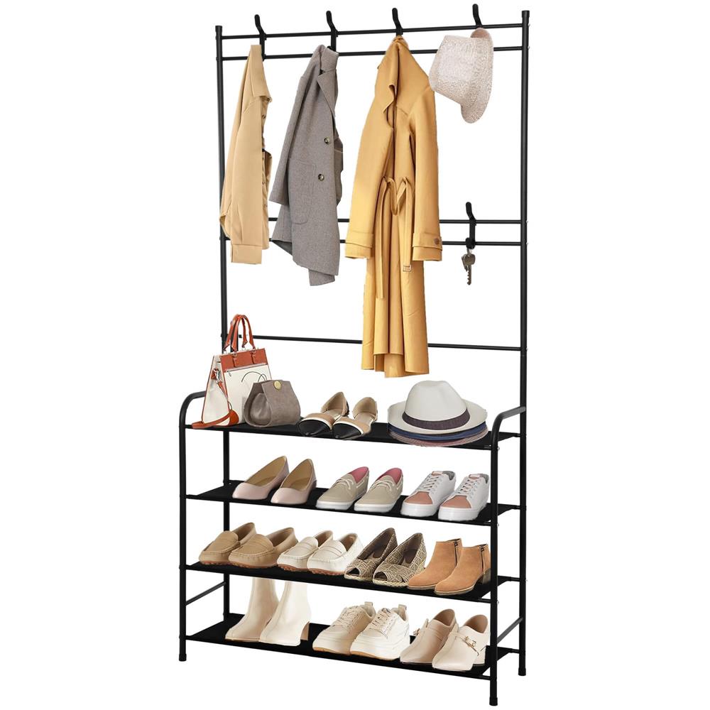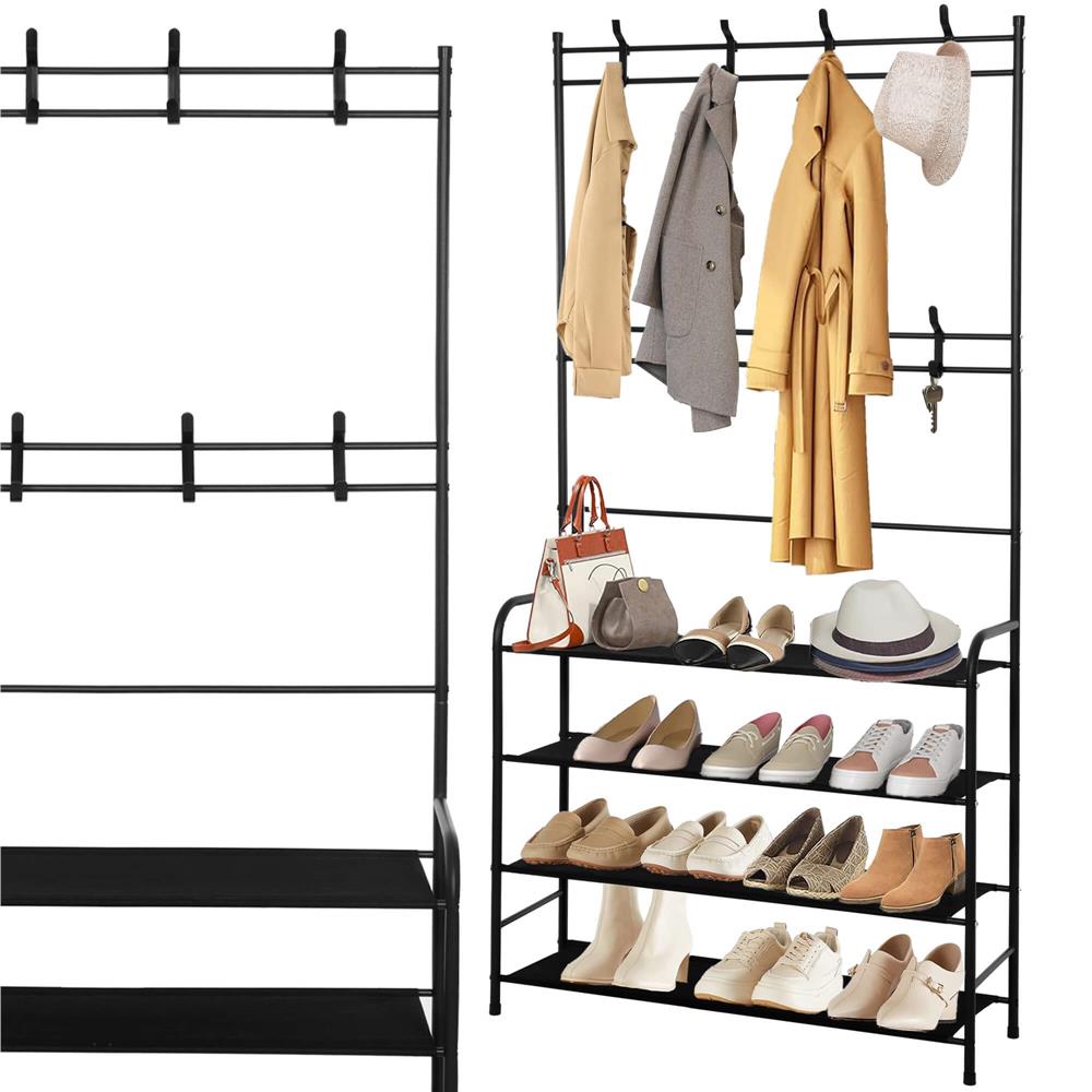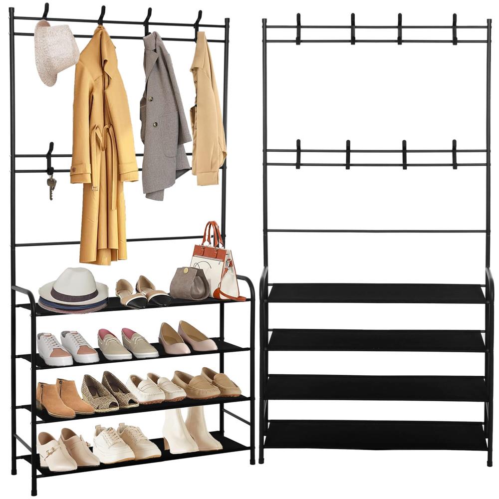 Cuier pentru haine cu banc de depozitare pantofi pe 4 polite, cadru metalic, 25x80x150cm, negru Household NewTrend